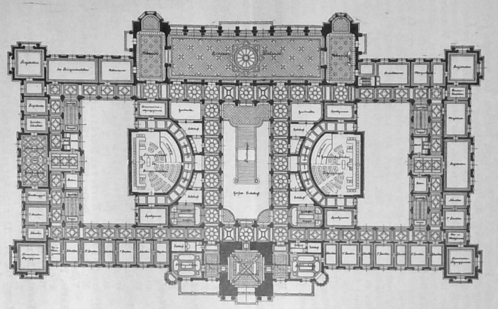 Wie sich nun der weitere Verlauf der Angelegenheit gestalten wird, hängt zunächst noch von den Beschlüssen der städtischen Behörden ab. Soviel kann einstweilen mitgetheilt werden, dass ein engerer Wettbewerb geplant ist, zu dem einzelne der mit Preisen ausgezeichneten Bewerber sowie einige andere Architekten eingeladen werden sollen. Dem neuen, engeren Wettbewerb soll, wie man hört, der Stier’sche Grundriss als Basis dienen. Zu den Grundzügen des Wettbewerbes hat das Preisgericht Stellung genommen. Wir ziehen indess vor, darüber erst dann zu berichten, wenn das Protokoll der Jury in unseren Händen sein wird. Vielleicht ist bis dahin auch der weitere Verlauf der Angelegenheit der Entscheidung entgegengereift.