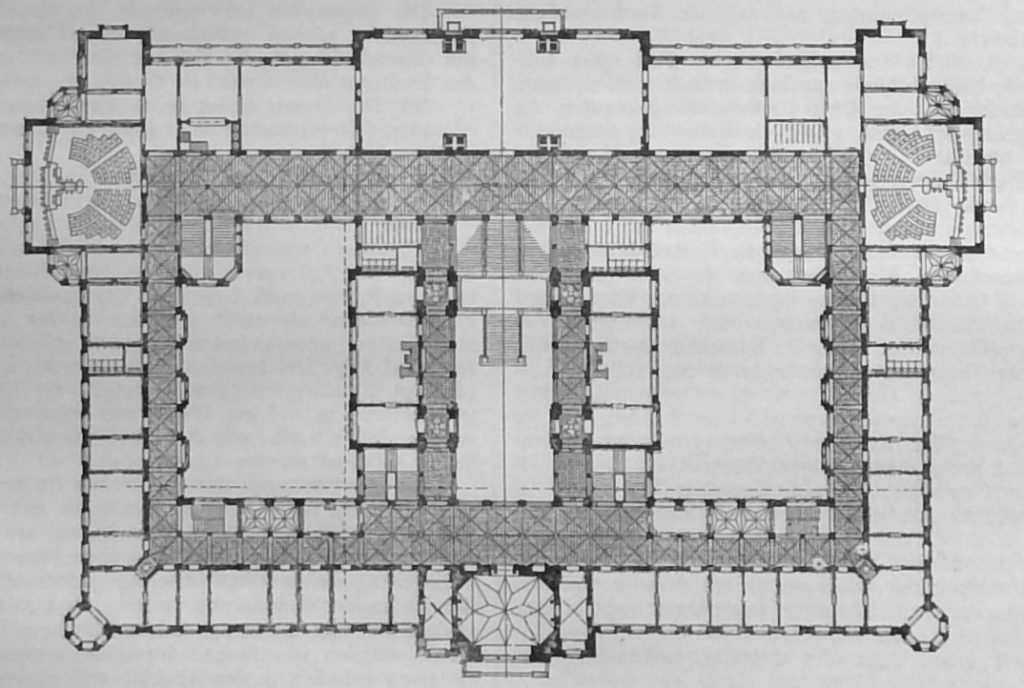 Die einzelnen 6 Entwürfe haben eine etwas eingehendere Beurtheilung gefunden. Ueber den diesem Berichte beigegebenen Entwurf des Hrn. O. Schmidt-Dresden bemerkt das Protokoll, derselbe zeige bei ähnlicher Lage der Hauptsäle, wie bei dem Stier’schen Entwurf, eine sehr klare Grundrissdisposition; die Kassenlokalitäten und Korridore entbehrten indess theilweise einer guten Beleuchtung. Das Aeussere steht in künstlerischer Beziehung auf einer sehr hohen Stufe, doch führe die Grösse des Gebäudes zu ästhetischen Bedenken und beeinflusse die Situirung desselben in höchst unvortheilhafter Weise.