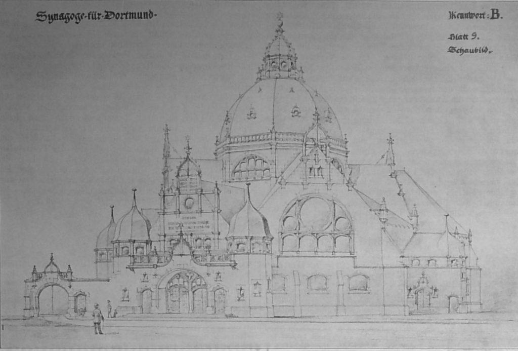 Der Wettbewerb um Entwürfe für eine neue Synagoge für Dortmund, dessen Ausgang wir bereits erwähnten, war mit 59 Entwürfen beschickt, die den Versuch unternommen hatten, auf der Grundlage einer Bausumme von 350 000 M. einschl. der inneren Ausstattung und der Arbeiten für die Umgebung des neuen Gebäudes ein zweckentsprechendes Gotteshaus zu entwerfen. Die Aufgabe, mit einer verhältnissmässig so niederen Summe allen Ansprüchen für die Ausübung des Kultus zu genügen, ohne der nothwendigen Würde und Monumentalität des Bauwerkes Eintrag zu thun, war eine keineswegs leichte. Sie wurde aber gelöst.