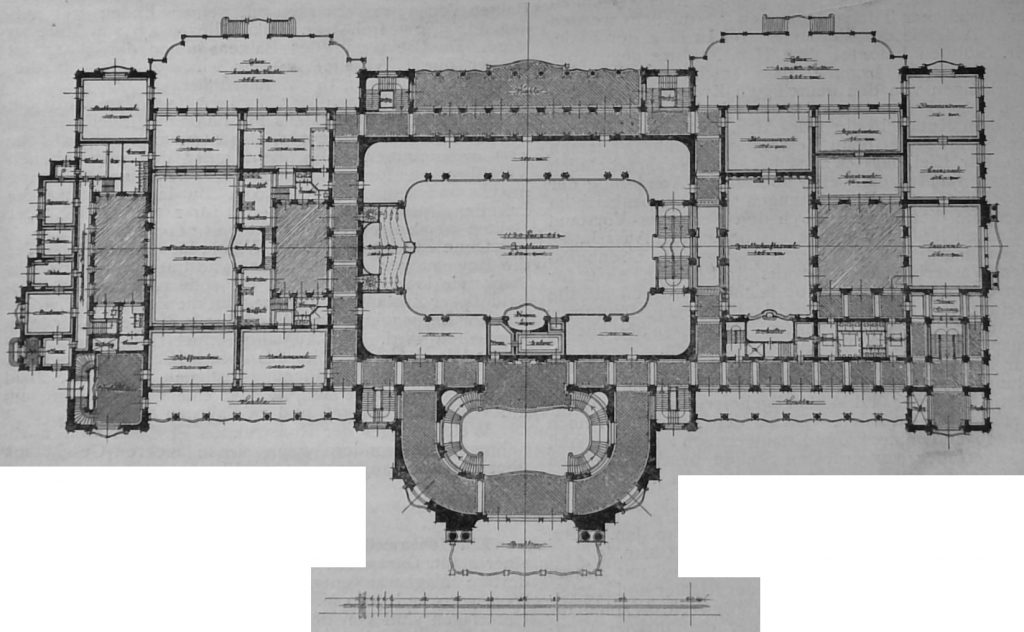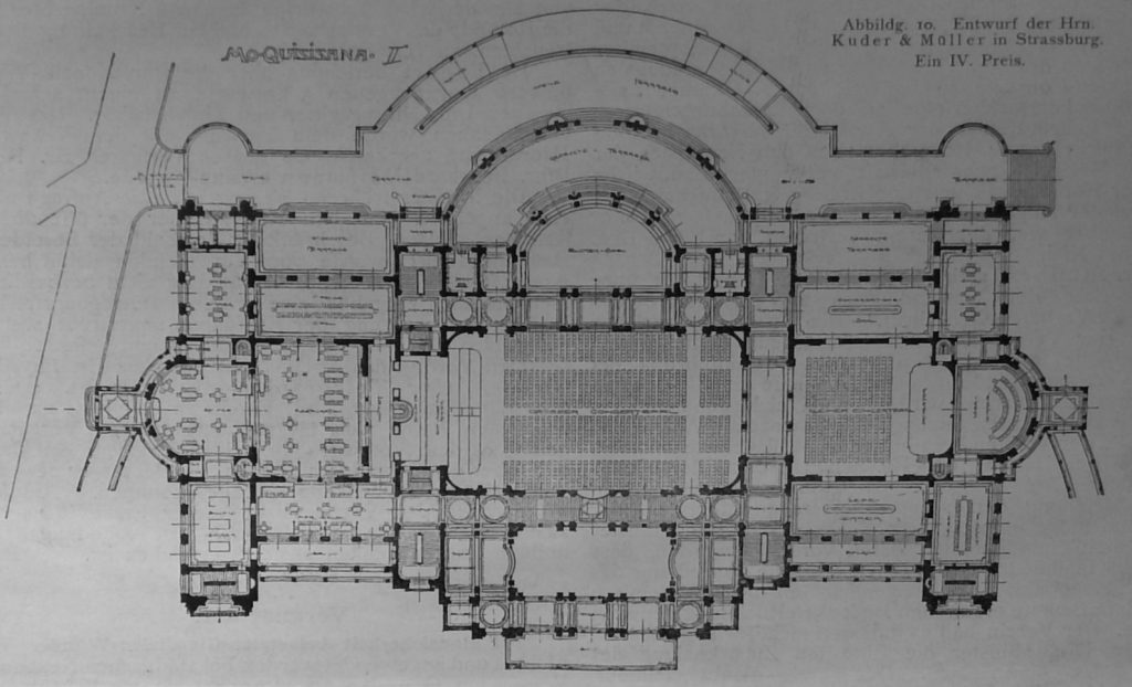 „No. 10. Das schöne Projekt krankt an dem Uebelstande, dass des Saal-Fussboden zu ebener Erde liegt, während die Gesellschaftsräume mit der Saalgallerie im oberen Geschoss zusammenhängen. Dieser Misstand könnte allerdings ohne wesentliche Aenderungen in der Plandisposition überwunden werden. Der westliche Mittelbau mit dem Hauptvestibül (Bahnhof) ist etwas zu stark entwickelt und lässt die zweigeschossigen Flügel fast gedrückt erscheinen. Mit anerkennenswerther Gewandtheite sind die Formen der späteren Renaissance gehandhabt, wenn gleich in manchen Dekorationsmotiven ein feinerer Maasstab zu wünschen wäre. Es fehlen einzelne kleinere Räume; auch sind die vorhandenen theilweise zu knapp gerathen.“