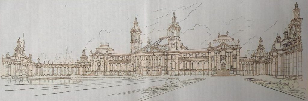 „No. 42 zeigt einen einfachen und gut disponirten Grundplan unter Verzichtleistung auf Hallen und Verbindungsgänge. Bei grossen Festlichkeiten ist diese Anlage für eine zusammenhängende Gesammtbenutzung aller Räume sehr günstig. Die Anlage von 2 grösseren Binnenhöfen vermittelt den rückwärts liegenden Räumen Luft und Licht in reicher wohlthuender Weise. Der Saalboden liegt 4 m über Terrain. Grosse Auffahrtrampen führen auf der Parkseite bis zu dieser Höhe hinan. Das Raumverhältniss des Saales erscheint nicht ganz fein abgestimmt, wie auch die Aussenarchitektur mit den beiden breiten Flankentreppenhäusern und ihren etwas schwerfälligen Zwiebeldächern. Die Fassaden sind im Stile des deutschen Barocco gehalten, die Mauerflächen mit Putz überzogen angenommen. Die Anschlussbauten an die Kolonnaden sind als grosse offene Durchfahrten gestaltet und dürften in dieser Form als zweckmässig erachtet werden, da sie die Durchblicke auf die baumreichen Anlagen gestatten. Der Entwurf lässt sich um einen nicht unwesentlich billigeren Preis, als ausgeworfen, wohl ausführen.“