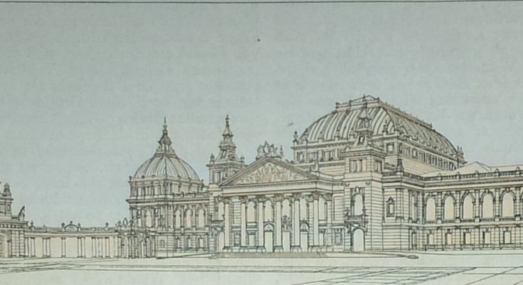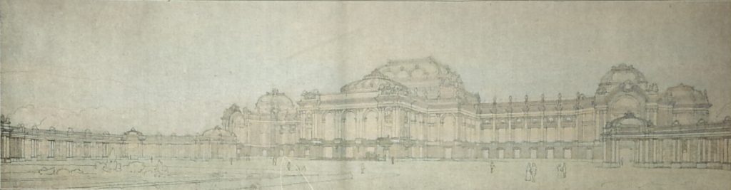 Der Saalfussboden ist 4 m hoch gelegt und die hieraus sich ergebende Horizontalgliederung des Neubaues ist auch bei diesem Entwurf ohne organischen Zusammenhang mit den Kolonnaden gewählt. Die im übrigen angemessene Architektur, die die Pariser Schule verräth und sich im wesentlichen eingeschossig auf kräftigem Sockel darstellt, trifft unter allen Entwürfen den Charakter des Hauses am besten.