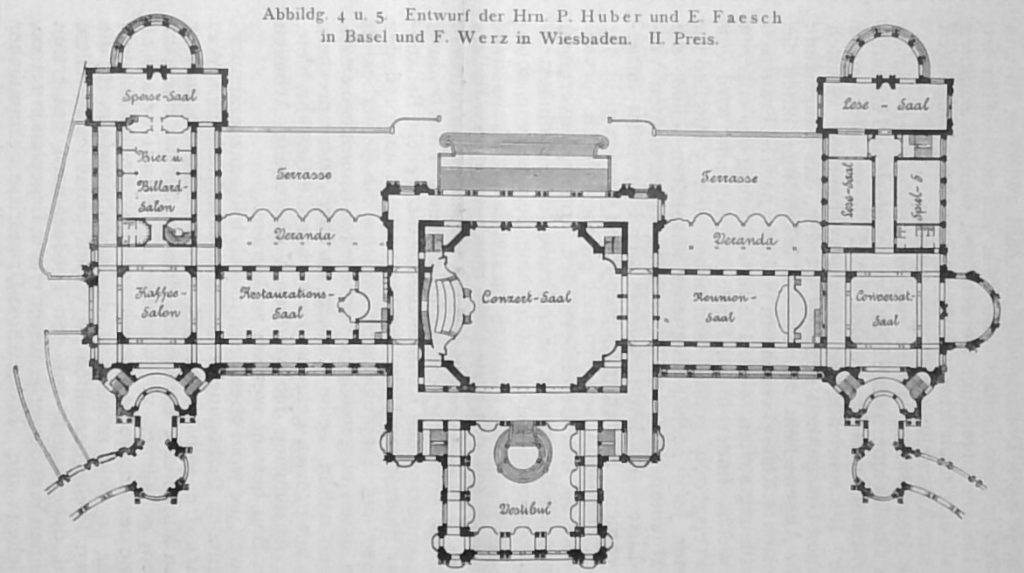 Die unmittelbare Aneinanderfügung der Säle, namentlich auch der Zusammenhang der kleineren Konversations-, Spiel-, Lese- und Restaurationssäle mit dem grossen Konzertsaal, wie wir sie bei den Entwürfen No. 37. „Aquae Mattiacae“ (I. Preis), No. 42 „Ein Kurgast“ (III. Preis), No. 28 „Andreastag“ (III. Preis), No. 36 „Präludium“ (IV. Preis), No. 40 „Quisisana“ (IV. Preis) u. a. sehen, wodurch bei verschiedenen Arbeiten, besonders bei No. 37 und No. 40 eine grossartige Raumfolge geschaffen wird, verdient unzweifelhaft den Vorzug.