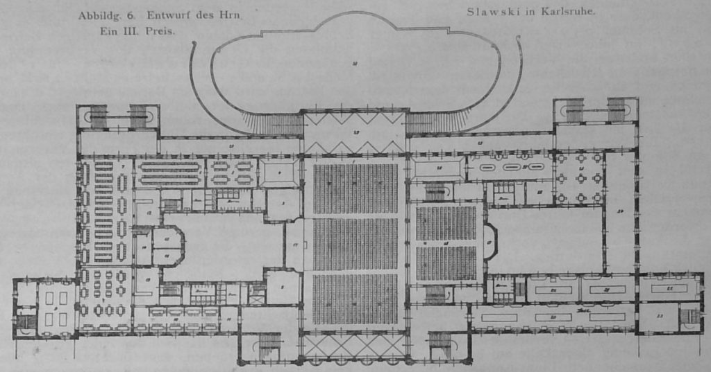 Von den beiden vorbesprochenen Arbeiten wieder erheblich abweichend gestaltet Reg.-Bfhr. Slawski in Karlsruhe seinen Kurhausentwurf, der ihm einen dritten Preis einbrachte. Dem Entwurf fehlt vor allem die schöne Raumfolge, die wir an den vorigen zwei Arbeiten gesehen haben; doch ist nicht zu verkennen, dass der Grundriss gewisse Vorzüge aufzuweisen hat, die auch in dem unten folgenden Gutachten des Preisgerichts hervorgehoben sind. Die Anlage hat einen zu wenig repräsentativen Charakter. Vollständig verfehlt ist die äussere Erscheinung, die – nicht immer mit feinem Formgefühl – in süddeutschem Barock gestaltet, wie weiter oben bereits erwähnt wurde, an der gegebenen Stelle recht wenig passend erscheint. Das Gutachten lautet: