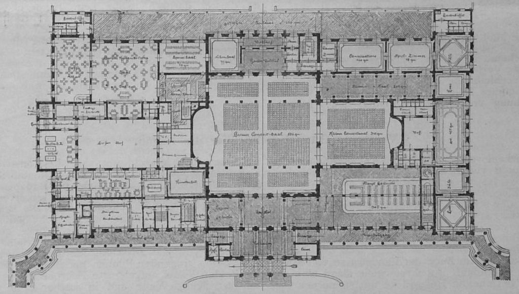 „No. 28. Der Grundriss des Hauptgeschosses zeichnet sich durch Klarheit und Schönheit in den Raumverbindungen aus. In ungestörter Folge umzieht der Gürtel der Restaurations- u. Unterhaltungsräume das mittlere Rechteck, welches die beiden Konzert-Säle in günstiger Gruppirung enthält. Zu beklagen ist, dass bei der angenommenen Höhenlage dieses Geschosses mehrfache Freitreppen nach dem Park hin nothwendig werden.
