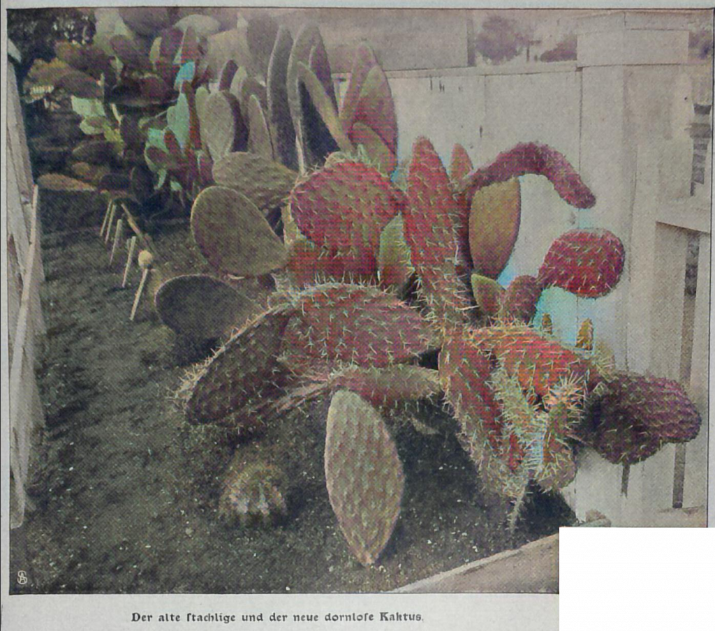 In ausgedehntem Maß hat sich der unermüdliche Züchter mit der Veränderung der Kaktuspflanzen beschäftigt. Es ist ihm gelungen, einen stacheligen wertlosen Kaktus dahin zu bringen, daß er alle Stacheln verloren hat und glatte Blätter als Futter für das Vieh und wohlschmeckende Früchte hervorbringt. Da dieser Kaktus auf dürrem Wüstensand gedeiht, kann er für manche Gegenden als Nutzpflanze von unermeßlichem Segen werden.