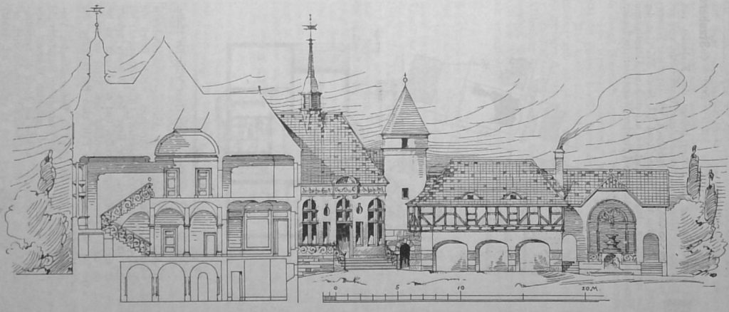 Im Aeusseren spielt die rothe Farbe des Thones in ihrer Zusammenwirkung mit einem landschaftlichen Hintergrund eine herrschende Rolle: roth sind die Fassadenflächen, roth sind auch die stattlichen, zur künstlerischen Mitwirkung berufenen Dachflächen. Licht sind die Architekturtheile und namentlich die plastischen Ornamentflächen der Giebel. Im übrigen: keine sklavische Axenanordnung, keine Symmetrie, sondern Gestalten aus dem Bedürfniss in Grundriss und Aufbau.