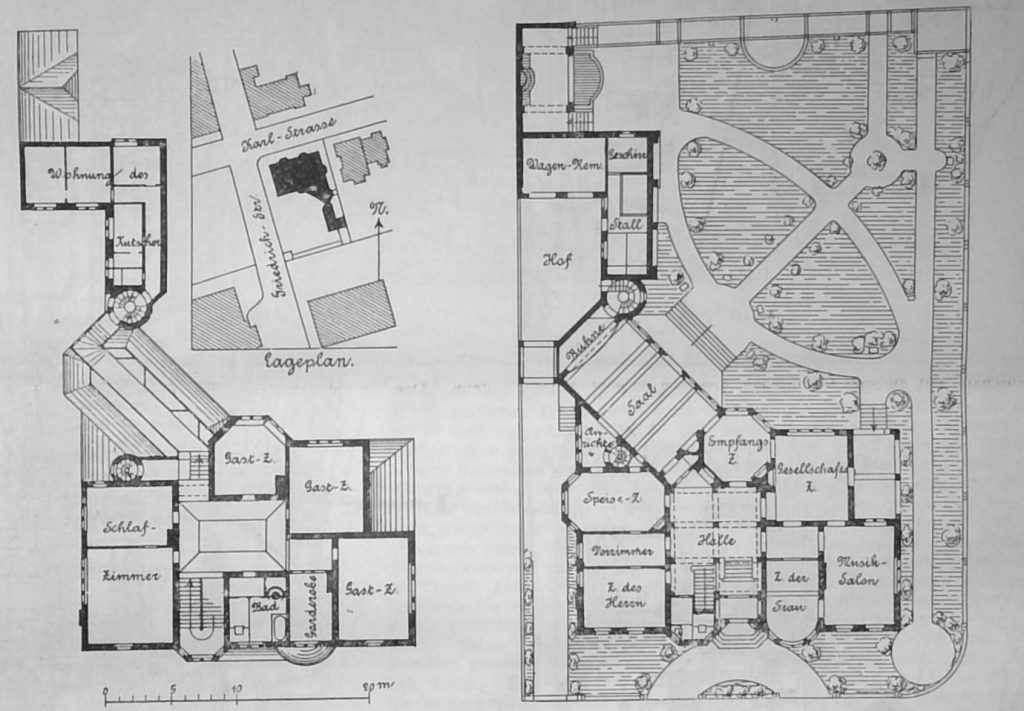 Der sogenannte Salon fehlt. Das Obergeschoss enthält Wohnzimmer, Schlafzimmer, 2 Gastzimmer, ein Schrankzimmer und Nebenräume, das Dachgeschoss eine Malstube, Mägdekammern und ausgiebige Nebenräume. Die Raumeintheilung ist eine gedrängte und glückliche.