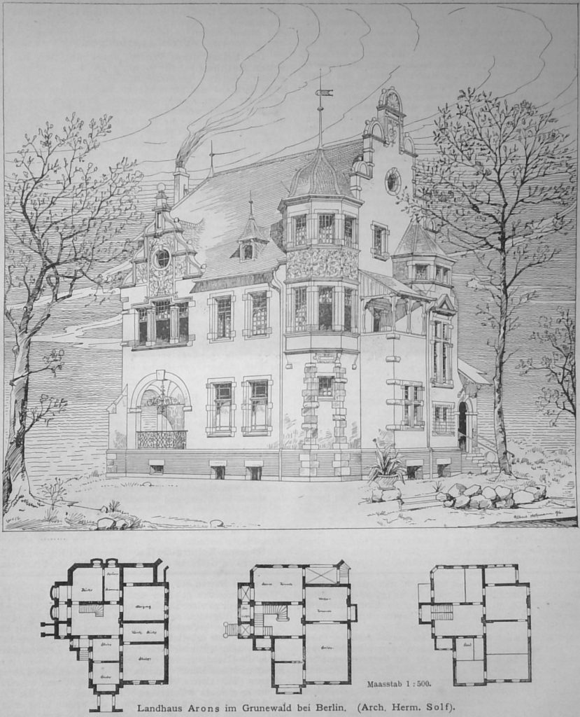 Das Haus Kalisch-Lehmann ist ein Landhaus in des Wortes bester Bedeutung. Mehr dem städtischen Charakter neigt sich das gleichfalls von Hermann Solf am Johannaplatz im Grunewald errichtete Landhaus Arons zu. Es ist in den Jahren 1890/91 nach der Bauordnung für das platte Land erbaut und besteht aus Keller-, Erd-, Ober- und Dachgeschoss. Die Grundrissgruppirung ist eine etwas reichere, als bei den vorher besprochenen beiden Werken, Das im Lichten 2,70 m hohe Kellergeschoss enthält einen geräumigen Flur, Küche, Speisekammer, Vorrathsräume, Waschküche, Raum für eine Niederdruck-Dampfheizung und 3 Dienstbotenzimmer. Das 4,05 m hohe Erdgeschoss enthält Vorraum, Diele, Anrichteraum, Speisezimmer, Wohnzimmer, Salon, ein Zimmer des Herrn und einen kleinen Wintergarten; das 3,40 m hohe Obergeschoss Diele, 6 Wohn- und Schlafzimmer und ein Badezimmer. Das Dachgeschoss hat zwei grössere und zwei kleinere Zimmer ergeben. Die Aussengestaltung ist durch Giebelaufbauten, Thürmchen, offene und bedeckte Veranden und Erker auf allen Seiten des Hauses eine lebhafte und malerisch gruppirte geworden. Im Sockel bestehen die Flächen und Fenstergewände aus weissen Steinzeugverblendern. Ueber dem Sockel sind sämmtliche Architekturtheile, soweit nicht Holz infrage kommt, aus rothem Göttinger Sandstein erstellt, die Flächen in naturfarbigem Mörtel geputzt. Das Eckthürmcehen, sowie der Nordgiebel haben durch Bildhauer Gieseke al fresco modellirte Mörtelverzierungen erhalten. Wo die Giebel, Erker usw. das Gesims frei gelassen haben, da ist dasselbe als übertretendes Sparrengesims ausgebildet worden. Einzelne Theile das Dachgeschosses sind als sichtbares Fachwerk hergestellt; das Dach wurde nach deutscher Art mit kleinen Schiefern gedeckt.