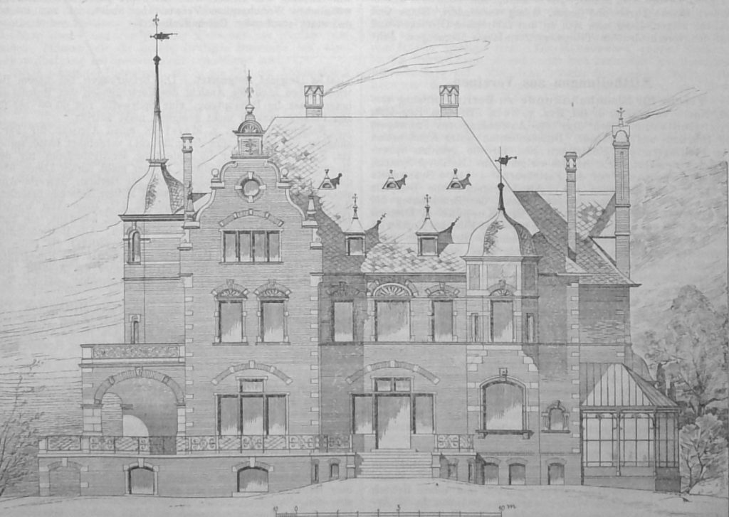 Für das Wohngebäude waren verlangt: ein geräumiger Vorraum mit Treppenhaus, ein Zimmer des Herrn mit Vorzimmer, ein Zimmer der Frau, ein Empfangs- und ein Gesellschaftssalon, ein Speisezimmer nebst Anrichteraum, ein Musiksalon, ein Saal für grössere (Gesellschaften, der sich in Verbindung mit einem Nebenraume zu kleineren Aufführungen eignen sollte, eine Halle, welche auch als Wintergarten zu benutzen war, dann Schlafzimmer, 3 Gastzimmer und eine Reihe von Nebenräumen für die Hauswirthschaft, darunter auch Stallungen mit Kutscherwohnung, also wie man sieht, ein auf grösseren geselligen Verkehr zugeschnittenes Einfamilienhaus. Die Lösung Tscharmann’s ist in den beigegebenen Illustrationen dargestellt. Die englischen Einflüsse sind unschwer zu erkennen, sie treten aber gegen die deutsche Auffassung in bemerkenswerther Weise zurück. Bei der Grundrissanlage ist versucht, unter Verzicht auf alle akademischen Axen lediglich eine dem Bedarf und dem Bauplatze angepasste Lösung zu gewinnen und zwar unter Berücksichtigung der Himmelsrichtung und mit dem Bestreben, einen möglichst geräumigen Garten übrig zu behalten. Zu der möglichst frisch und lebhaft gruppirten, besonders durch Farbe und Silhouette wirkenden Fassadenbildung wurde der Architekt durch die Ueberzeugung gedrängt, dass nur ein im schärfsten Gegensatz zu den umliegenden grossen Staatsbauten durchgebildeter Bau gegen deren grosse, glatte rothe Ziegelflächen aufkommen könne. So ist also der schöne Entwurf sowohl aus seinem inneren, wie aus den durch die Umgebung ihm auferlegten Bedingungen entstanden.