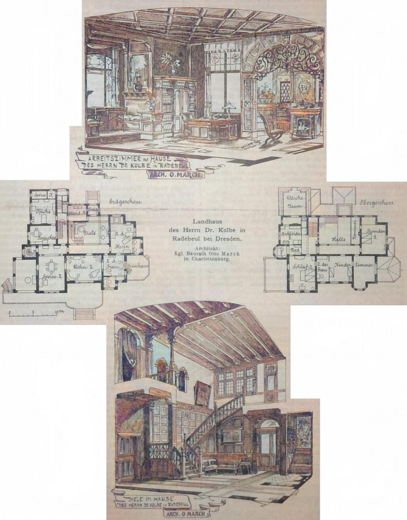 Eine vertiefte Pflege, im Sinne englischer Vorbilder vorwiegend, findet der Bau des deutschen Einfamilienhauses durch den kgl. Brth. Otto March in Charlottenburg. In einer Reihe ausgezeichneter Bauten dieser Art, welche über die verschiedensten Gegenden Deutschlands zerstreut sind, ist der Grundsatz einer Verinnerlichung der Wohnungseinrichtung durch intime Ausgestaltung des Grundrisses und durch findige Ausnutzung aller sich ergebenden Hohlräume des Aufbaues zu verwirklichen versucht, ein Versuch, der durchgehends auch erreicht ist. Parallel hierzu geht eine künstlerische Ausstattung des Aeusseren und Inneren, die ein starkes individuelles Gepräge im Sinne des Zuschnittes auf den jeweiligen Bauherrn besitzt und sich von der üblichen Schablone in derselben weiten Weise entfernt, wie die Gesammtauffassung das deutschen Familienhauses des Künstlers. In dieser Gesammtauffassung, die einer ausgesprochen deutsch empfindenden Seele entspringt, ist es auch begründet, dass das von dem Künstler gestaltete Familienhaus trotz aller fremden Einflüsse, doch im wesentlichen deutschen Charakter sich bewahrt hat. Das mag einmal daher kommen, dass in der fremden Erscheinung das vorwiegend deutsche Element herausgegriffen ist, und dass andererseits, wenn dieses eine starke Anglisirung z. B. erfahren hat, eine Rückbildung im deutschen Sinne versucht wird.