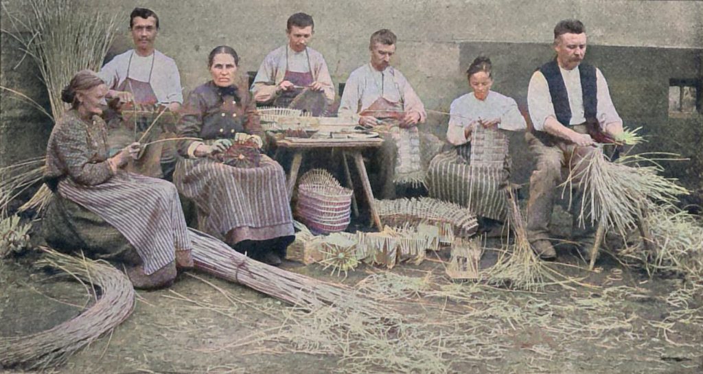 Die grobe Korbmacherei bestand schon lange und besteht ja heute in vielen Gegenden noch. Die Landwirte flechten mit ihren derben Händen Fruchtkörbe zum Einsammeln der Preißelbeeren und anderer Früchte, Wasch- und Tragkörbe und sonstige Hauswirtschaftsartikel an langen Winterabenden. Große Kunst entwickeln sie dabei nicht. Und das Material wächst ihnen meist wild am Strand des Baches ihrer Wiesen. Was aber in einer Gegend stets auf gleicher Stufe, auf gleichem Können stehen bleibt – in andern entwickelt es sich durch das Eingreifen einiger findiger Köpfe und durch den Zwang der Not zu einer beachtenswerten Höhe.