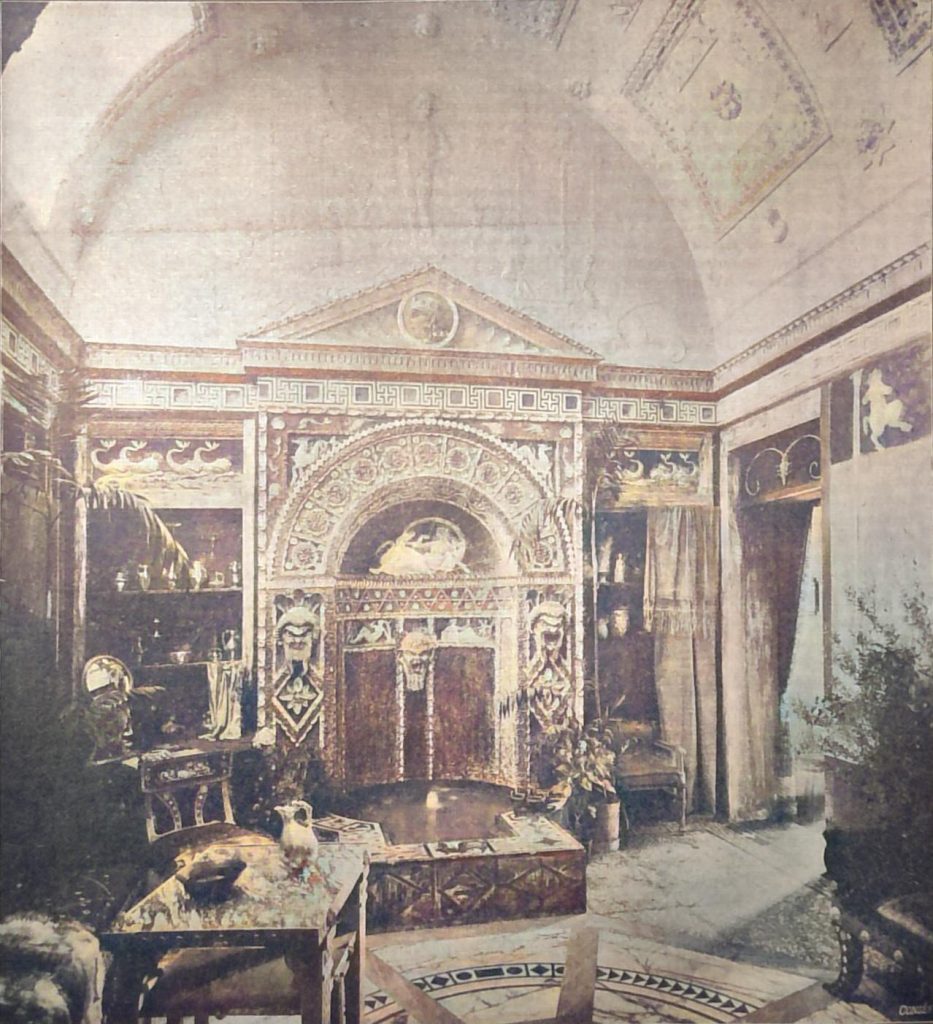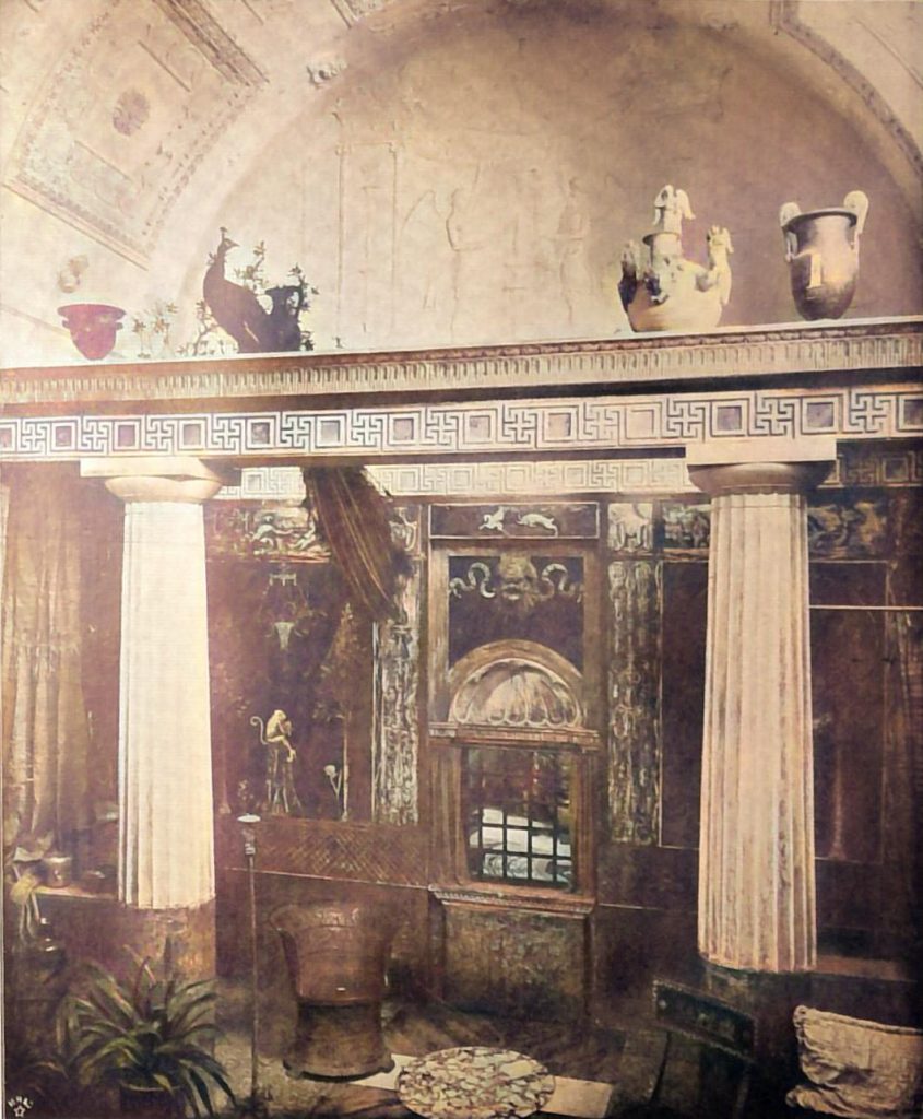 Es ist ein bezauberndes Stück antik römischen Lebens, welches uns aus diesem Raume entgegenströmt. Darf ich einen Vergleich ziehen mit dem, was man in dieser Beziehung den Besuchern der Pariser Weltausstellung des Jahres 1889 in der rue des habitations bot, so kann nur die thurmhohe Ueberlegenheit des Seidl’schen gegenüber dem entsprechenden Garnier’schen Raume festgestellt werden. Wer erinnerte sich nicht bei seiner Betrachtung des schönen Schiller’schen Gedichtes „Pompeji und Herculanum“: