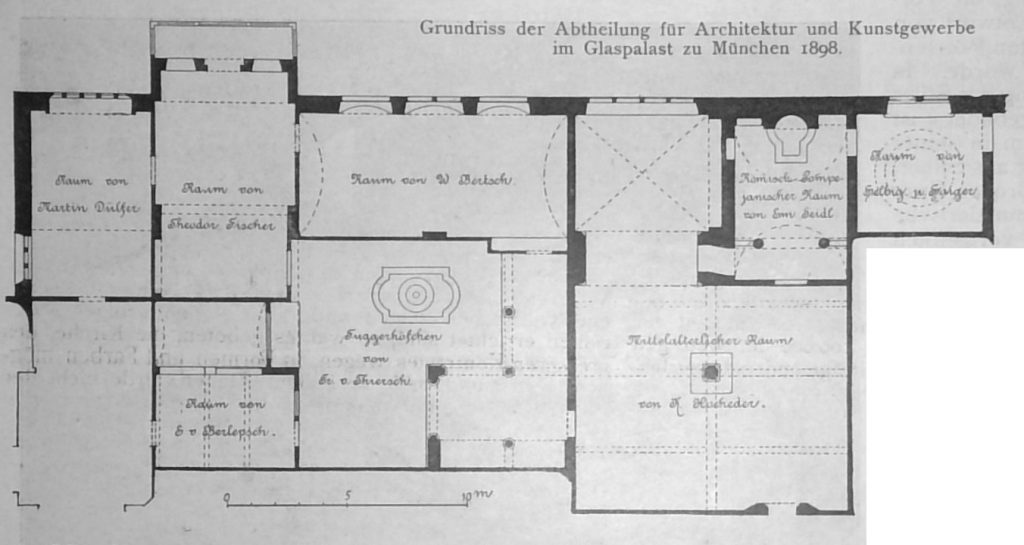 Für die Entfaltung des Kunstgewerbes kommen in München sechs Räume inbetracht, welche als hochbedeutsame Leistungen betrachtet werden müssen (s. den Grundriss). Da ist zunächst, abseits von der kunstgewerblichen Abtheilung, die Vorhalle, die nach dem Entwurf von Mart. Dülfer von Anton Pössenbacher ausgeführt wurde. In einer freien Auffassung des Stiles Louis XVI. durchgebildet, ist der elegante Vorraum in seiner feinen Farbengebung aus Silber, verschiedenfarbiger Bronze, Grau und Violett eine die künstlerische Auffassung Dülfer’s vortrefflich wiedergebende Arbeit, durchaus verwandt mit dem grösseren Raum, welchen Dülfer weniger als Selbstzweck, denn als Ausstellungsraum für das Kunstgewerbe entwarf und welchen Völker, die „Vereinigten Werkstätten“ und Schmidt & Co., in Einzelheiten nach Entwürfen von Frl. Erber und Bernhard Pankok ausführten. Auch hier eine lichte Gesammt-Farbenstimmung aus Weiss, Silber, Graugrün, Violett, verschiedenen Bronzetönen usw., auch hier eine zwischen Louis XVI. und Empire sich bewegende architektonische Formengebung, aber durchsetzt mit einem chinaisirenden Flächenornament. Ein anheimelnder Theil des Raumes ist der Nischenausbau mit seinen kleingetheilten Fenstern. Ernster und tiefer in der Farbenwahl, aus rothen und blauen Grundtönen in mannichfaltiger Schattirung zusammengestimmt, ist der schöne Raum von Theodor Fischer, der durch Fritsche, Schmidt & Co. und Barth & Co. usw. ausgeführt wurde. Es ist kaum möglich, von dem Raume eine Beschreibung zu geben, da er so sehr auf Stimmung berechnet ist. Historische Formen sind an ihm nicht zur Verwendung gekommen, man wird in ihm vielfach an aussereuropäische Einflüsse erinnert. Der Raum ist eigenartig und von jenem strengen Ernst in der Stimmung, welche diesem hervorragenden Leichter und heiterer ist wieder der Raum, welchen Hr. Arch. Wilh. Bertsch beeinflusste. Karl Gross, L. Ulsess, Franz Naager, Carl Ule usw. waren seine Mitarbeiter. Der Raum erhebt in bescheidenerem Grade den Anspruch, für sich selbst zu wirken, er lässt mehr die Ausstellungs-Gegenstände zur Geltung kommen. Die letzteren sind auch nicht durchweg zum Charakter des Raumes passend ausgesucht, denn sie bilden in der Hauptsache das Ausstellungsgut des Münchener-Kunstgewerbe-Vereins; eine einheitliche Wirkung ist daher weder beabsichtigt, noch deshalb auch erreicht. Streng einheitlich degegen ist der von den Architekten Helbig & Haiger entworfene und eingerichtete Raum, eine sehr beachtenswerthe Leistung. „Als der Grossvater die Grossmutter nahm“, zu Anfang unseres Jahrhunderts, da mochten sie wohl einen solchen Raum mitbekommen haben, wenn sie vorsichtig in der Wahl ihrer Eltern waren. Denn der Raum ist bei aller Einfachheit der Formgebung kostbar. Pössenbacher führte ihn in der Hauptsache aus und in seiner bemerkenswerthen künstlerischen Erscheinung führt er uns vor Augen, wie schnell wir leben und wie sehr die Biedermeierzeit für uns bereits beginnt, eine historische Zeit in des Wortes überkommener Bedeutung und ihr Stil ein historischer Stil zu sein. Weiter auf den Raum einzugehen, wäre Sache der kunstgewerblichen Berichterstattung.