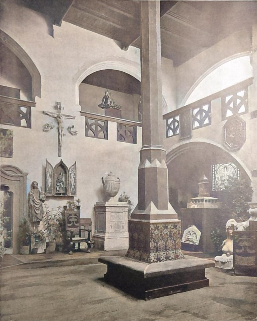 Sind die beiden hier genannten Räume Ausstellungsstücke an und für sich, gleichsam naturgrosse Modelle, so ist der mittelalterliche Raum, welcher neben dem römischen auf unserer Beilage dargestellt und von Hrn. Prof. Karl Hocheder entworfen wurde, sowohl naturgrosses Modell wie Ausstellungsraum. Ausserordentlich schlicht ist seine aus Wandflächen, Oeffnungen und dem Holzdeckenabschluss gebildete Gestalt. Bewegung kommt in dieselbe lediglich durch die Verschiebungen des unteren und des oberen Grundrisses in der dem Beschauer entgegengesetzten Ecke. Die einheitliche Raumwirkung unterbricht in malerischer Weise die schöne Mittelstütze mit ihrem kralligen Unterzug. Was der Raum in architektonischer Hinsicht sonst bietet und womit er in einen ausgesprochenen Gegensatz zu den übrigen beiden Räumen tritt, das ist seine in jeder Beziehung überraschende Anspruchslosigkeit. Keine Farbe, kein Ornament, kaum ein Profil. Auch wenn man die Einrichtungsgegenstände, welche durch Hocheder , Littmann und Pfann ausgewählt wurden, hinwegdenken würde, würde er kaum an Eindruck verlieren, weil dieser Eindruck in der Hauptsache in einer Gegensatzwirkung beruht, von welcher die zufälligen Ausstellungsstücke unabhängig sind. Diese sind sorgfältig und angemessen gewählt: Altäre (Böhler), Todtenschilde, Teppiche, Gobelins, ein Missale (Attenkofer), Stühle, Glasbilder, Statuen (Radspieler) usw. sind das mannichfaltige Geräth, welches den Raum belebt.