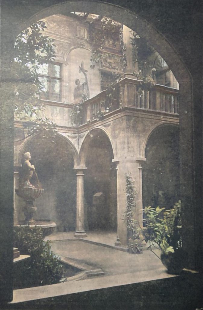 Nicht minder bestechend in seinem graziösen Reiz war der Raum, welchen Prof. Friedr. von Thiersch einzurichten übernommen hatte und welchen wir in unserer nächsten Nummer zur Darstellung bringen. Der Katalog sagt von ihm, dass seine architektonischen Einzelformen, sowie die Motive der Wandmalereien einem Hofe entlehnt seien, welcher sich im Fuggerhause zu Augsburg befindet und der als eins der frühesten Werke deutscher Renaissance in seinen Bauformen von der venetianischen Frührenaissance abhängig ist. Die nur noch in Spuren vorhandenen Wandmalereien tragen die Jahreszahl 1515 und werden Hans Burgkmair zugeschrieben. Das Fuggerhöfchen, soweit es das Eintagsmaterial zuliess, in seinem alten Glanze wiederzugeben, war die feine Absicht des Künstlers. Es haben dabei mitgewirkt die Hrn. Arch. R. Senf, Maler Jos. und Georg Widmann und Mangold, sowie die Firmen Böck’s Wittwe und Barth & Co., sämmtlich in München. Die Ausstattungsstücke lieferten L. Bernheimer, A. Bondi in Florenz, Julius Böhler und Bildhauer Rauch in München. So ist etwas entstanden, was wieder in anderer Art wie der römische Wohnraum ein reizvoller Anziehungspunkt dieses Theiles der Ausstellung für weitere, auch nicht sachverständige Kreise, geworden ist und der zahlreiche Besuch dieser Räume zeigte, dass die mit ihrer Herstellung verbundene Absicht erreicht worden ist. –