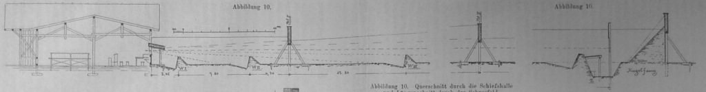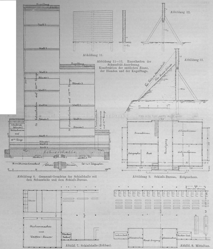 Eine etwas eingehendere Beachtung erfordert sodann noch der eigentliche technische Kern der ganzen Anlage, die Schiesshalle nebst Bureau und Schussfeld.