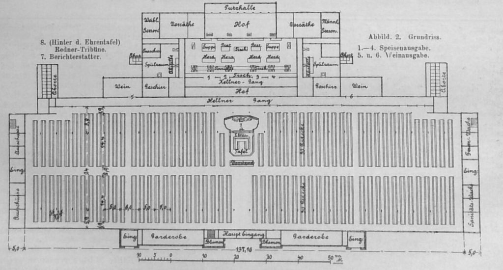 Der Küchen- und Wirthschaftsbau, nach Entwürfen von Zimmermeister Goerisch durch Hof-Zimmermeister Krause und Töpfer-Meister E. Brucks ausgeführt, war durchaus übersichtlich eingerichtet und hat allen gerechten Anforderungen im weitesten Sinne entsprochen. Küchengerüche konnten nicht in die Halle dringen. Natürlich war in der Küche der Fussboden mit Pflaster versehen, während die Dächer mit Pappe und Oberlichten eingedeckt waren. Die Herde waren aus Rohkacheln für Steinkoblenfeuerung hergestellt. Um von den Anforderungen, die an solche Festküchen gestellt werden, eine Andeutung zu geben, sei hier angeführt, dass bei dem grossen Festmahle folgende Speisemassen zur Verwendung kamen: 2000 kg Rinderbraten, 800 kg Lachs, 2000 Hähne, 22 hl grüne Gemüse, 19,25 hl Kartoffeln, 1500 Köpfe Salat, sowie zu einem Nachtischgericht: 150 kg Erdbeeren, 2 hl Sahne.