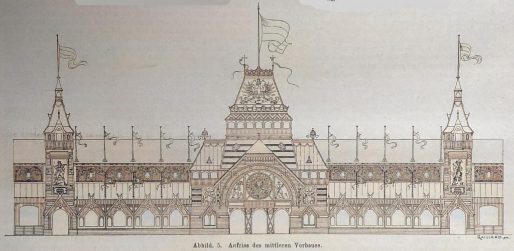 Was bereits über den Gabentempel gesagt wurde, gilt auch für den Thorbau. Die Mittel hatten nicht ganz ausgereicht, um ihn in den Abmessungen herzustellen, welche nöthig gewesen wären, um das gewählte Motiv eines mittelalterlichen Festungsthores einigermassen glaubhaft erscheinen zu lassen. Auch wirkte es wie Ironie, dass man unter das Fallgatter mitten in die Oeffnung nachträglich eine Kassenbude gesetzt hatte.