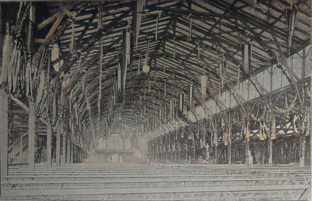 Ergänzend sei bezüglich der Annordnung des Innenraums noch bemerkt, dass auf den 3 Emporen über dem Haupt-Eingange und an den Giebeln je ein Musikkorps untergebracht war. Erst nach dem Haupt-Festbankett ward in dem östlichen Theile der Halle eine zwei Gebinde- und die ganze Hallenbreite umfassende Tribüne für 400 Sänger aufgebaut.