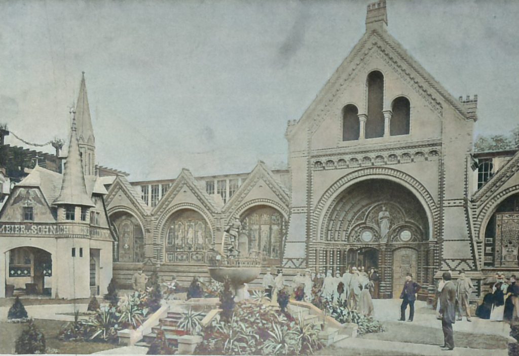 Für diese Theile besorgten die Eisenkonstruktion Brass & Hertslet, die eisernen Oberlichte, Thüren, Thore usw. König, Kücken & Co., die Dachdeckerarbeiten W. Neumeister, die Zimmerarbeiten F. Plumplun & Co., W. Küster und B, Treee Klempnerarbeiten P. Thom, die Glaserarbeiten F. Krüger in Spandau, die Aluminium-Eindeckung und die Thurmspitzen P. Thom, die Blitzableitung Xaver Kirchhoff, die Drahtputzarbeiten der Hallen J. Donath & Co., die Drahtputzarbeiten der Kuppeln, Thürme, Wandelhalle mit Zubehör Boswau & Knauer, die Tischlerarbeiten Gebrüder Weinmann, die Schlosserarbeiten A. Prause, die Bildhauerarbeiten der grossen Haupthalle in der Längsaxe der Kuppel R.Schirmer, die Bildhauerarbeiten des Aeusseren der Thürme, Kuppeln, Wandelhalle usw. Zeyer & Drechsler. Die Künstler der grossen Kuppelhalle sind bereits früher genannt worden. Die Malereien der Halle in der Queraxe der Kuppel sind von Prof. Kips und Unger entworfen und ausgeführt, andere einfachere Dekorations-, Maler- und Anstreicherarbeiten führten die Hrn. F. Baars, Sobotta und Stefansky aus. Die Brunnenanlage vor dem Hauptgebäude ist nach dem Entwurf von Bruno Schmitz von Zeyer & Drechsler in Hydrosandstein ausgeführt. Die Gruppen zu beiden Seiten der Wandelhalle stammen von Prof. N. Geiger. Die Eindeckung des Daches der Hallenbauten mit Dachpix erfolgte durch die Firma Kleemann & Co. Das grosse Kesselhaus mit den Schornsteinanlagen hinter dem Hauptgebäude ist von G. Lütgen-Borgmann aus gelben, rothen, grünen und weissen Verblendern errichtet.