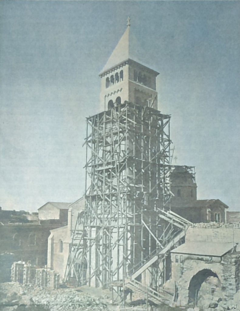 Nach den vorhandenen urkundlichen Nachrichten und aufgrund eines Vergleiches der Bauformen mit denjenigen anderer in Palästina noch erhaltener Werke aus der Kreuzfahrer-Zeit glaubt Hr. Adler die Erbauung der Kirche, welche einst den Namen St. Maria latina major führte, in die Zeit zwischen 1120 bis 1130 setzen zu sollen. Etwas später, etwa zwischen 1160-1170, dürfte das grosse Nordportal hinzu gefügt worden sein, das ehemals den einzigen Eingang bildete, der von aussen her in die auf der Westseite völlig verbaute Kirche führte. Ihr Grundriss könnte auf eine dreischiffige Hallen-Anlage schliessen lassen; in Wirklichkeit war der Bau jedoch eine Pfeiler-Basilika, deren Ostjoche als Querhaus mit achtseitiger Vierungs-Kuppel ausgebildet waren; über dem Westjoch des südlichen Seitenschiffes war ein Thurm errichtet. Für die Bestimmung der Höhenmaasse lieferte die im wesentlichen erhaltene südliche Apsis den erforderlichen Anhalt; ebenso konnten alle Einzelformen mit genügender Sicherheit festgestellt werden. Letztere waren übrigens ziemlich einfacher Art: bescheidener plastischer Schmuck war nur an dem Nordportal vertreten. Während im Aeusseren durchweg Rundbögen verwendet sind, treten im Inneren schon Spitzbögen auf; die stilistische Haltung des Ganzen weist auf südfranzösische Vorbilder hin, die freilich stark „reduzirt“ sind. Die flach geneigten Dächer waren mit Steinplatten abgedeckt. Aehnliche Formen, jedoch in noch grösserer Einfachheit, zeigen die einen Kreuzgang umschliessenden Baulichkeiten des ehemaligen Klosters, dessen Räume durchweg mit Tonnen oder scharfgratigen Kreuzgewölben überwölbt waren.