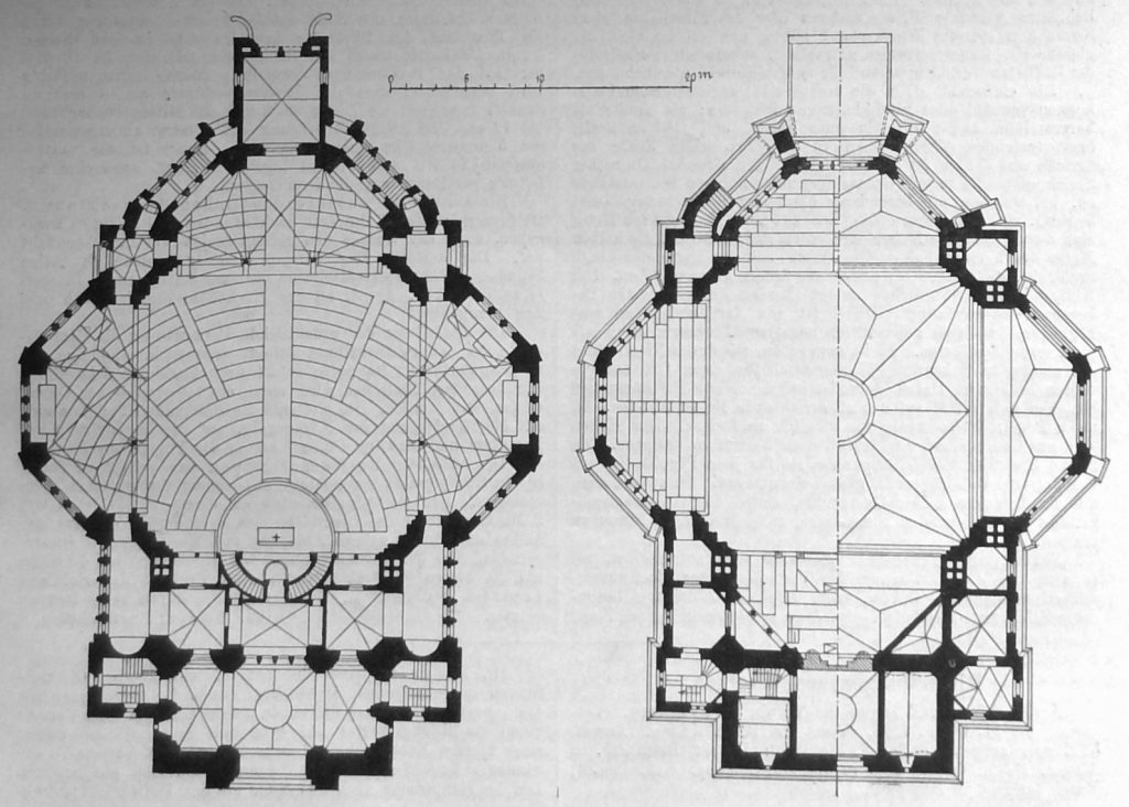 Dass die Gesammt-Anordnung der Anlage, die nach allem voraus Gegangenen wohl keiner Erläuterung mehr bedarf, dem zugrunde gelegten Programm aufs strengste entspricht und dass sich in ihr ein ebenso zweckmässiger wie eigenartiger Typus für das kirchliche Versammlungshaus einer evangelischen Gemeinde darstellt, kann von einem Unbefangenen unmöglich geleugnet werden – mag er für seine Person auch ein anderes kirchliches Ideal bevorzugen und daher jenes Programm grundsätzlich verwerfen. Allerdings ist der betreffende Typus nicht ganz rein ausgeprägt, sondern mit einigen, aus örtlichen Rücksichten hervorgegangenen Besonderheiten verschmolzen. Der aus der Lage der Kirche am westlichen Schlusspunkte der bis zu ihr ansteigenden Rheinstrasse entspringende Wunsch einer östlichen Thurmstellung einerseits, das – nach unserem Ermessen gerade in diesem Falle unberechtigte – Festhalten an einer östlichen Altarstellung andererseits haben zu der ungewöhnlichen Vorhallen-Anlage hinter der Sakristei und damit zu einem äusseren Aufbau der Kirche geführt, der mit dem Innern in gewissem Widerspruche steht. Jeder, der das Bauwerk sieht, wird zunächst vermuthen, dass sich der Haupteingang im Osten, der Altar im Westen befinde und dass die westliche Vorhalle die Sakristei enthalte. Aber dieser Widerspruch ist ein zufälliger und hat mit dem System, das der Ge taltung des eigentlichen Kirchenraumes zugrunde liegt, nicht das Geringste zu thun; wenn daher ein im anderen Parteilager stehender Kritiker lebhaft Protest dagegen eingelegt hat, dass man einen solche „Lügenbau“ (wie er sich geschmackvoll ausdrückt) als Vorbild kirchlicher Anordnung empfehlen wolle, so hat ihm entweder Beschränktheit oder böser Wille die Feder geführt. – Nicht viel mehr Gewicht wird man dem Einspruche derjenigen beimessen können, welche die auch in diesem Falle angewendete, für einen zur Raumerweiterung dienenden Ausbau natürliche Form der als Polygon-Abschnitt gestalteten Abside für eine protestantische Kirche um deshalb verwerten, weil sie an den Chor einer katholischen Kirche erinnere. Ernstere Beachtung verdient dagegen wohl der Einwand, dass es unorganisch sei, die konzentrisch um den Altarplatz geordneten Sitze von den seitlichen Emporen schräg überschneiden zu lassen. Es ist indessen hierauf zu bemerken, dass dieser Umstand in der Grundriss-Zeichnung mehr und störender auffällt, als in Wirklichkeit, und dass jene konzentrische Anlage der Sitze an sich keine unbedingte Nothwendigkeit ist.