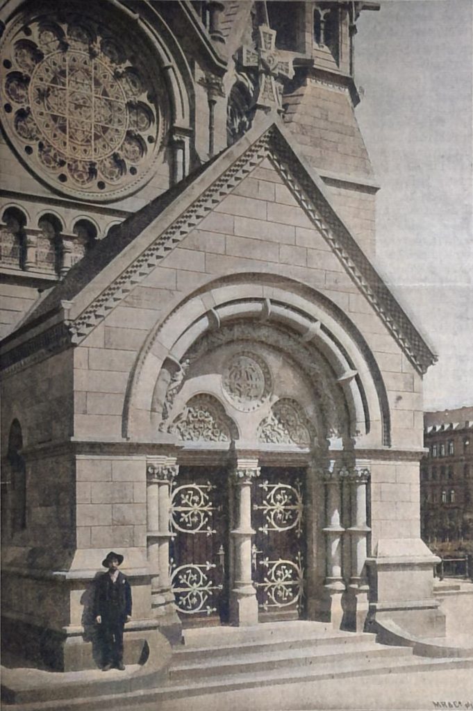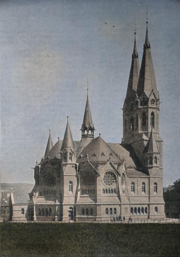 Für das Aeussere der Kirche, deren eigenartige Detailbehandlung die mitgetheilte Ansicht der westlichen Eingangshalle ersichtlich macht, ist hellgelber Königsbacher Sandstein aus Pfälzer Brüchen, für das Innere heller graugrünlicher Sandstein aus der Pfalz zur Anwendung gelangt.