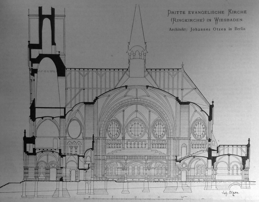 Architekt: Johannes Otzen in Berlin. Als wir vor 4 Jahren (in No. 43, Jhrg. 91) d. Bl. den zur Ausführung bestimmten Entwurf des Geh. Reg.-Raths Prof. Joh. Otzen für die dritte evangelische Kirche Wiesbadens veröffentlichten, glaubten wir auf die aussergewöhnliche Bedeutung hinweisen zu müssen, welche dem Werke sowohl infolge des ihm zugrunde gelegten, von den z. Z. in Deutschland herrschenden kirchlichen Ueberlieferungen abweichenden Bauprogramms, als auch infolge der selbstständigen, künstlerischen Durchführung dieses Programms zukommt.