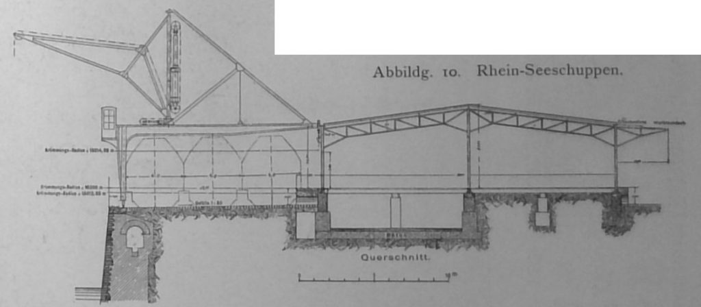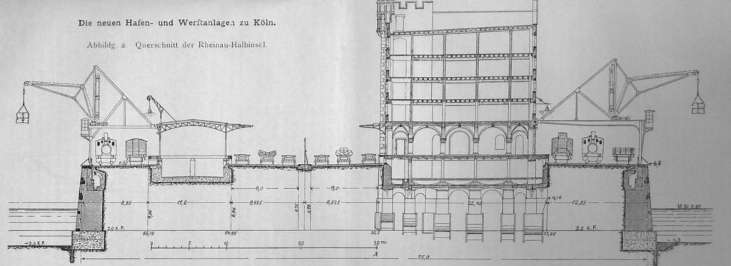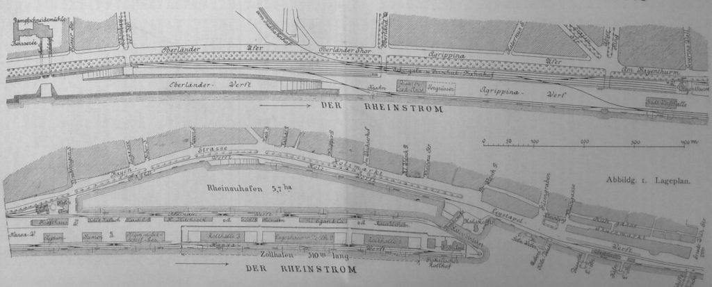 Oberhalb der Rhein-Seeschuppen (vergl. Abb. 10) folgen allgemeine Lagerplätze für den freien Verkehr und dann die ebenfalls für freien Verkehr bestimmte öffentliche Werfthalle. Die weiteren Strecken des Agrippina-Werfts sehen noch ihrer endgiltigen Bestimmung entgegen; den Schluss stromaufwärts bildet das im Bau begriffene Lagerhaus der Kölner Waaren-Credit-Anstalt und ein 30 Tonnen-Krahn für ungewöhnlich schwere Lasten. Da beckenseitige Werft der Rheinau-Halbinsel, Rheinau-Werft genannt, ist nebst seinen acht Speditionsschuppen für den Rheinverkehr bestimmt und an Kölner Firmen im ganzen Umfange verpachtet. Die Rhein-Seeschuppen haben eine lichte Breite von rd. 20 m bei 40-80 m Länge, sind in Eisenfachwerk mit eisernen Dachbindern hergestellt und zur Hälfte der Breite unterkellert. Die Schuppen für den Rheinverkehr haben nur 9 m Breite, 30-100 m Länge, Unterkellerung und ebenfalls Eisenfachwerk-Konstrution. Die Mitte der Rheinau-Halbinsel nimmt die Fahrstrasse ein, so dass Schifffahrt, Eisenbahn, Lagerhäuser, Schuppen und Stadt-Fuhrwerk hier den innigsten Zusammenschluss finden. –