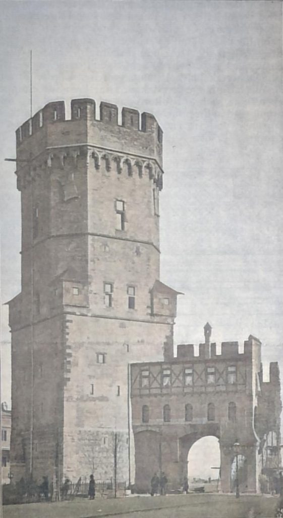 Der erwähnte elektrisch-hydraulische Kraftbetrieb des Kölner Rheinauhafens aber soll keineswegs zu dem Schlusse führen, dass allgemein dieser Betrieb dem rein elektrischen überlegen sei. Denn erstens hat seit der Feststellung der Kölner Betriebsart die Konstruktion elektrischer Krähne sehr grosse Fortschritte gemacht, und zweitens finden sich selten so ungewöhnlich günstige Verhältnisse für eine hydraulische Druckleitung wie hier vor. Der in einem in den Werftmauern ausgesparten Kanale verlegte Druckrohrstrang bildet nämlich einen in sich geschlossenen und durch zwei Querstränge verbundenen Kreis, in dessen Mitte die Presspumpen stehen. Zu Gunsten des elektrischen Antriebes sprachen drei wesentliche Umstände, nämlich: die stete Bereitschaft von Kraftstrom aus dem städtischen Elektrizitätswerk, der grosse Vorrath an unbenutzter Energie während des Tages, da der starke Verbrauch in der Stadt erst Abends stattfindet, und die Ersparniss eines besonderen Kesselhauses nebst allem Zubehör auf dem kostspieligen und räumlich beschränkten Hafengelände. Einen besonderen Reiz gewinnt der Kölner Werft- und Hafenbau durch die Verbindung mit werthvollen Resten der mittelalterlichen Stadtumwallung. Den nördlichen Anschluss der letzteren an den Rhein bildete das sogen. Kunibertsthürmchen, auch schlechthin „Thürmchen“ oder „Weckschnapp“ genannt. Dasselbe ist als ein kleines Schmuckstück der neuen Rheinuferstrasse noch in der Wiederherstellung begriffen. Den südlichen Rheinanschluss der Umwallung aber bezeichnet der altehrwürdige trutzige Bayenthurm, der in der Geschichte der Stadt eine ebenso bedeutsame Rolle spielt, wie im Rheinpanorama derselben. Dieser Thurm (vgl. Abb. 1 u. 11) ist nebst dem anstossenden Theil der Stadtmauer, welcher seit dem Mittelalter, mittels Freitreppe erreichbar, den Thurmzugang gebildet hat, nicht blos erhalten und wiederhergestellt, sondern organisch mit den modernen Verkehrsanlagen vereinigt worden. Ein wieder eröffneter Bogen der Stadtmauer gewährt den Lokomotiven Einlass auf das altstädtische Ufergelände, um dort die Eisenbahnwagen auf den verschiedenen Werften zu vertheilen. Es ist ein seltsames Glückspiel, dass die mittelalterlichen Baumeister der Kölner Stadtbefestigung schon zu Ende des zwölften Jahrhunderts die Maasse des Normalprofiles des lichten Raumes der heutigen Vollbahnen vorgeahnt haben, denn der alte Thorbogen umschreibt genau das Normalprofil. So ist der Bayenthurm dem Hafenverkehr nicht hinderlich; er bildet in den Gleisen und Schuppen und Hallen einen überaus angenehmen Ruhepunkt und ist auf der wiederhergestellten Freitreppe von der neuen Rheinuferstrasse über das Bahngleise hinweg zugänglich; er enthält eine Wohnung für einen Amtsdiener und mehre grosse, hohe Säle, denen eine endgiltige Bestimmung noch nicht zugewiesen ist. In Vorschlag gebracht ist die Benutzung als Bauarchiv, d. h. als geordneter, auch dem Bürger geöffneter Aufbewahrungsort für alle technisch oder künstlerisch werthvollen Zeichnungen und Modelle der städtischen Bauämter.