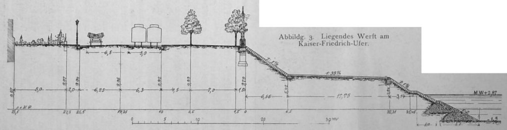 Der Raum für die linksrheinischen Anlagen ist im wesentlichen dem Rheinstrom abgewonnen worden, indem auf der Strecke von der Rheinauspitze bis zum Oberländer Thor, dem Anschlusspunkte der neuen Stadtumwallung an den Rhein, im Abstande von 45-105 m vom Ufer eine 2 km lange, annähernd senkrechte Werftmauer im Rheine erbaut wurde. Sie wurde bis zum Lande hinterschüttet (Abbildg. 1), gleichzeitig aber durch Vertiefung, der Flussohle und Abbaggerung des rechten Ufers der Mittelwasser- und Hochwasser-Querschnitt wieder hergestellt. Man hat dadurch Platz gewonnen zur Anlage der 75 m breiten, beiderseits von senkrechten Ufermauern eingefassten Rheinau-Halbinsel (Abbildg. 2) und zur wesentlichen Vergrösserung des nunmehr ebenfalls von senkrechten Werften rings umgebenen Rheinauhafens. Von hier rheinabwärts ist die Uferlinie ebenfalls um 5-25 m vorgeschoben, bis zur Machabäerstrasse sind die Werftmauern erneuert und weiterhin ein neues liegendes Werft (Abbild. 3) hergestellt worden. Auch stromaufwärts wurde an die 2 km lange Strommauer bis zur Gemeindegrenze ein neues abgeböschtes Werft, 2 m über Mittelwasser liegend, angeschlossen. Noch sind die Uferbauten nicht ganz vollendet. Sie stellen eine Länge von 9,3 km dar, davon sind 4,3 km senkrechte Werftmauern.