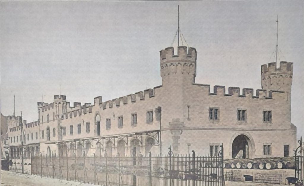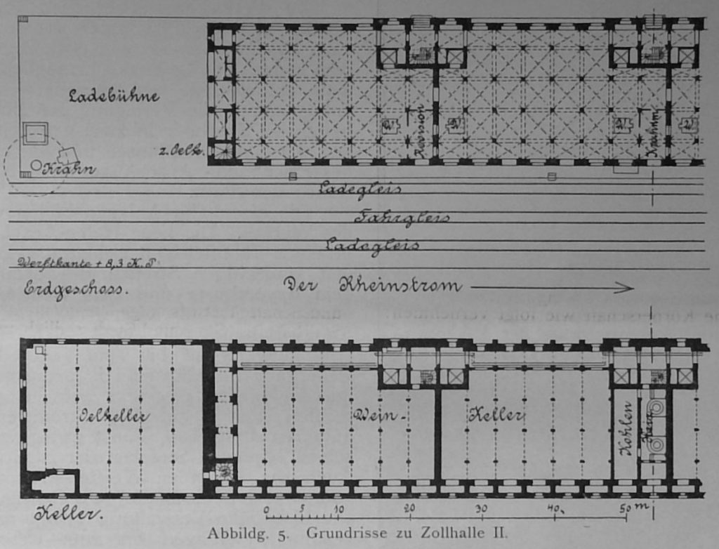 Der vierte Abschnitt der Aufgabe war ein architektonischer. Wir wählen diesen Ausdruck, weil es sich beim Kölner Hafen nicht blos handelte um gewöhnliche Speicher- und Schuppenbauten, weil vielmehr das Antlitz der Stadt umgestaltet werden sollte, weil ein weitgehender Eingriff sich vollzog in die Rheinansicht der Stadt, in das seit dem Mittelalter berühmteste und auch in der Gegenwart bedeutendste Stadtpanorama Deutschlands. Die Vertretung der Stadt bewilligte aus eigenem Antriebe erhöhte Mittel, um dieser Seite der Aufgabe gerecht zu werden. Die beiden Verwaltungs-Gebäude, nämlich das städtische Hafenamt am oberen und das fiskalische Hauptsteueramt am unteren Hafenende, ferner die drei mit den Revisionshallen verbundenen Lagerhäuser des Zollhafens wurden monumental gestaltet, nicht im Sinne eines weitgehenden Formenreichthums, sondern aus echten Baustoffen in einfacher, den Kunstformen aus Köln’s alter Blüthezeit angepasster Ausbildung. Das Hafenamt (Abb. 7) erinnert an die romanische, die Lagerhanser (Abbildg. 4 und 6) erinnern an die gothische Zeit, das Hauptsteueramt (Abb. 9) mit Nebengebäude an die frühe Renaissance. Da Hafenamt enthält die Diensträume der Hafen-, Eisenbahn und Postverwaltung und mehre Dienstwohnungen. Von den drei Lagerhäusern des Zollhafens hat das eine bei 120 m Länge ausser der Zollrevisionshalle des Erdgeschosses vier Oberböden und einen geheizten Keller, letzteren für ausländische Weine; die beiden anderen besitzen ausser der Zollhalle nur einen Oberboden und einen geheizten Keller. Angeschlossen sind an die Giebel der Lagerhäuser je zwei etwa 30 m lange, erhöhte, aber unbedeckte Ladebühnen, unter welchen abgesonderte Oel- und Spritkeller hergestellt sind (Abbildg. 5).