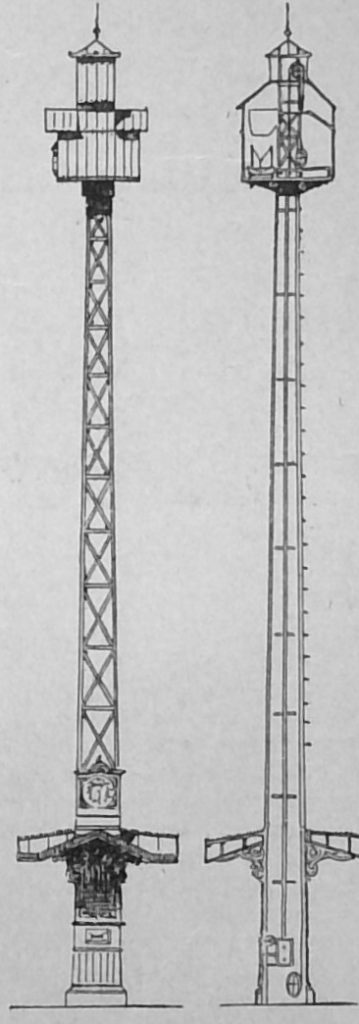 Betrachten wir nun kurz die einzelnen Stationen und Postämter. Bei einer Wanderung durch eine Stadt, die nach Piscicellis elektrischem System eingerichtet ist, bemerken wir zunächst eine Reihe Eisensäulen (s. Abb.), an denen an jeder zehnten unten ein Briefkasten angebracht ist; oben läuft eine besondere Drahtseilbahn, die nach dem Hauptpostamt führt. Das ist die Briefsammlerlinie. Sonach werden die Briefkastenleerer überflüssig. Alle fünf Minuten rollt vom Zentralamt aus ein leerer Sammelkasten das Drahtseil entlang. Bei jeder Briefsäule hält er an, und sogleich steigt im innern derselben der automatische Briefkasten herauf, entleert seinen Inhalt in den Sammelkasten und gleitet wieder geräuschlos hinab. Nach vollzogener Runde kehrt der Sammelkasten wieder zum Zentralamt zurück.