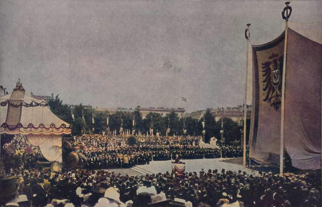 Stundenlang wogte vor Beginn der auf zwölf Uhr Mittag angesetzten Feier bereits auf den Straßen, die zum Königsplatz führen, eine große Menschenmenge einher, und früh nahmen die dazu berechtigten Personen ihre Plätze auf den Tribünen ein. Auf dem großen Platz entwickelte sich alsbald ein prächtiges, buntbewegtes und an Abwechslung reiches Bild. Hier die Uniformen der Offiziere, dort die der Minister und Kammerherrn, hier die Volksvertreter, dort die Gemeindevertreter im schwarzen Frack, der bei dem einen durch ein Ordensband, bei dem andern durch die goldene Amtskette eine kleine Aufheiterung erfährt, dazwischen die Universitätsrektoren in ihren farbigen Talaren. Auf den Tribünen eine große Anzahl Damen, vielfach trotz des trüben veränderlichen Wetters in hellen Sommerkleidern. Die Rampen des Reichstagshauses besetzt von Kriegervereinen, in der Mitte fünfzehnhundert Schüler und Schülerinnen die in ihren weißen Kleidern einen besonders frischen und lieblichen Anblick gewähren. Den Abschluß bilden die Abordnungen der Studenten von Universitãten, Technischen und andern Hochschulen, viele Hundert jugendlicher Gestalten in ihrem bunten „Wichs“ mit ihren zahlreichen Fahnen. Die Enthüllung des Bismarckdenkmals ist ein Nationalfest, aber auch Ausländer sind da, die einmal über das andere ihre Bewunderung darüber Ausdruck geben, mit welcher musterhaften Ordnung alles zugeht, mit welcher Ruhe die vielen Tausende von Menschen sich ansammeln, ohne daß die geringste Störung zu merken wäre.