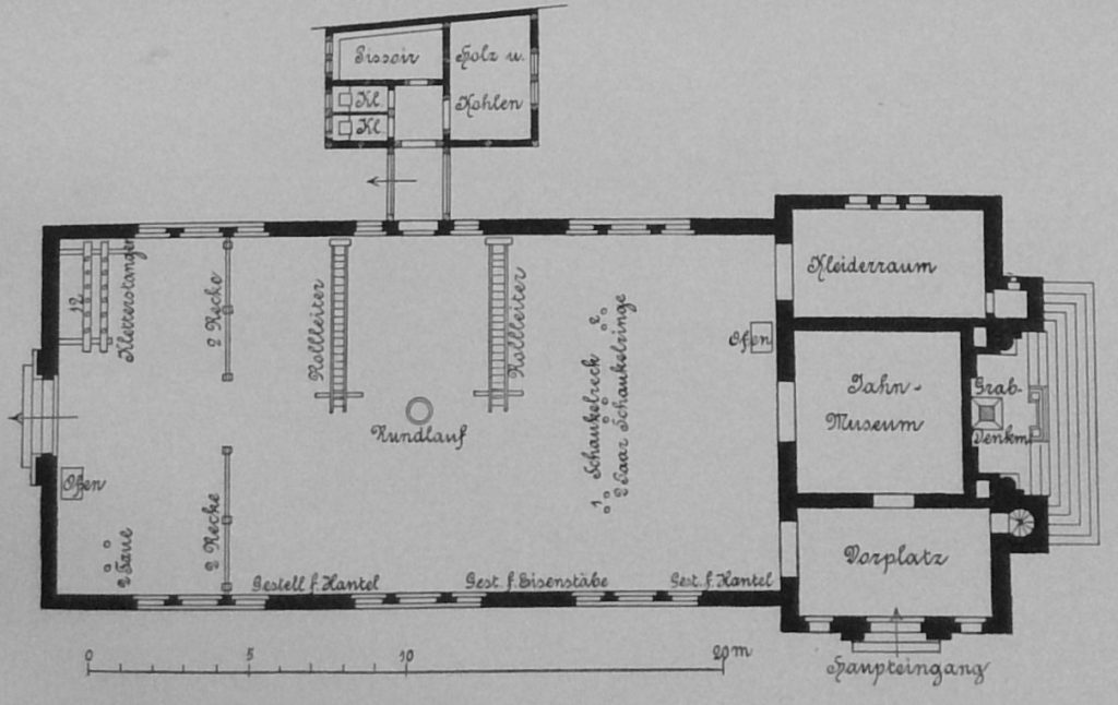 Später folgten u. a. das Denkmal in Jahn’s Geburtsort, Lanz bei Lenzen in der Priegnitz, sowie das Denkmal in der Hasenheide zu Berlin. Aber damit war den begeisterten Jüngern Jahn’s an dankbarer Verehrung und Anerkennung seiner grossen Verdienste noch nicht genug gethan, und so entstand die schöne und erhebende Idee, über der Stätte, wo Jahn dereinst enttäuscht und lebensmüde zur ewigen Ruhe eingegangen war, eine „Erinnerungs-Turnballe“ zu errichten. Jenes schlichte Postament mit der bereits vorhandenen Schilling’schen Jahnbüste sollte den Mittelpunkt des neu zu schaffenden Denkmalbaues bilden, unmittelbar an denselben anschliessend aber in einer neuen Turnhalle eine Stätte geschaffen werden, auf welcher alltäglich deutsche Jugend und deutsche Männer Leib und Seele sollten stärken können für das deutsche Vaterland, dessen Erstehen als geeintes Reich die Lebenshoffnung und das Lebensziel des Turnvaters Jahn gewesen ist.