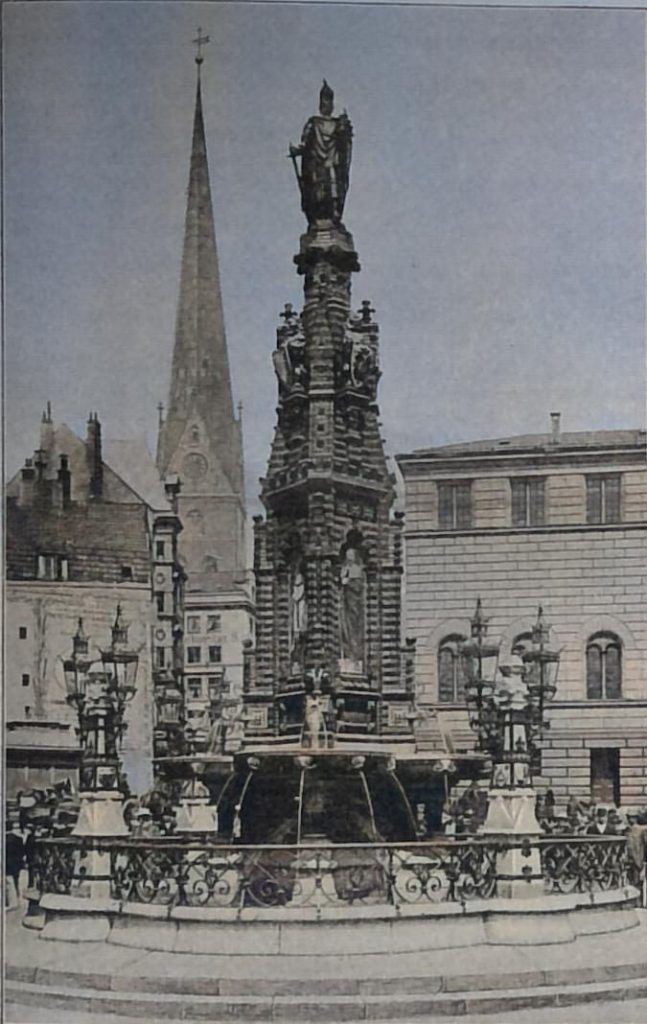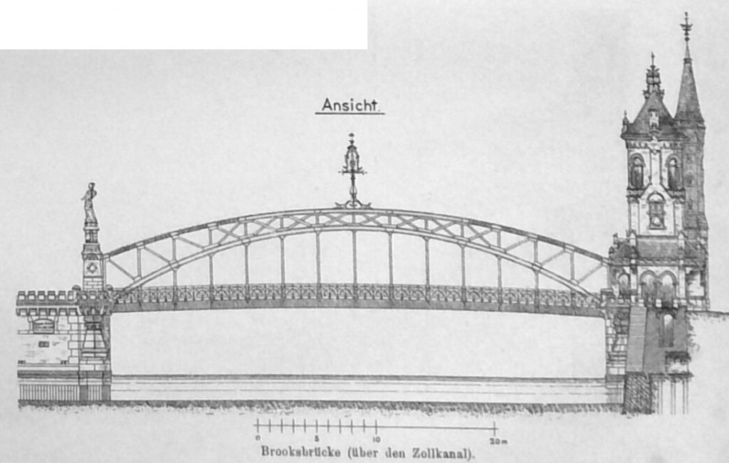 Mit den Mittheilungen über die als ein Stolz Hamburgs anzusehenden öffentlichen Gartenanlagen und die Ausstattung der öffentlichen Plätze, deren bildliche Beigaben reizvolle Proben der in unserem Ausstellungs-Berichte erwähnten kleinen architektonischen Leistungen, insbesondere der eigenartigen, von F. Andreas Meyer erfundenen Kunst-Schmiedearbeiten geben, sowie über die Denkmäler wird der Uebergang zu den Werken des Ingenieurwesens gewonnen, die in einer Stadt wie Hamburg den Leistungen des Hochbaus an Bedeutung selbstverständlich voran stehen müssen.