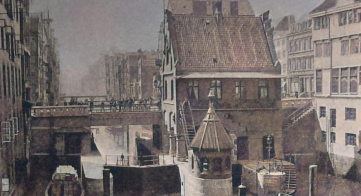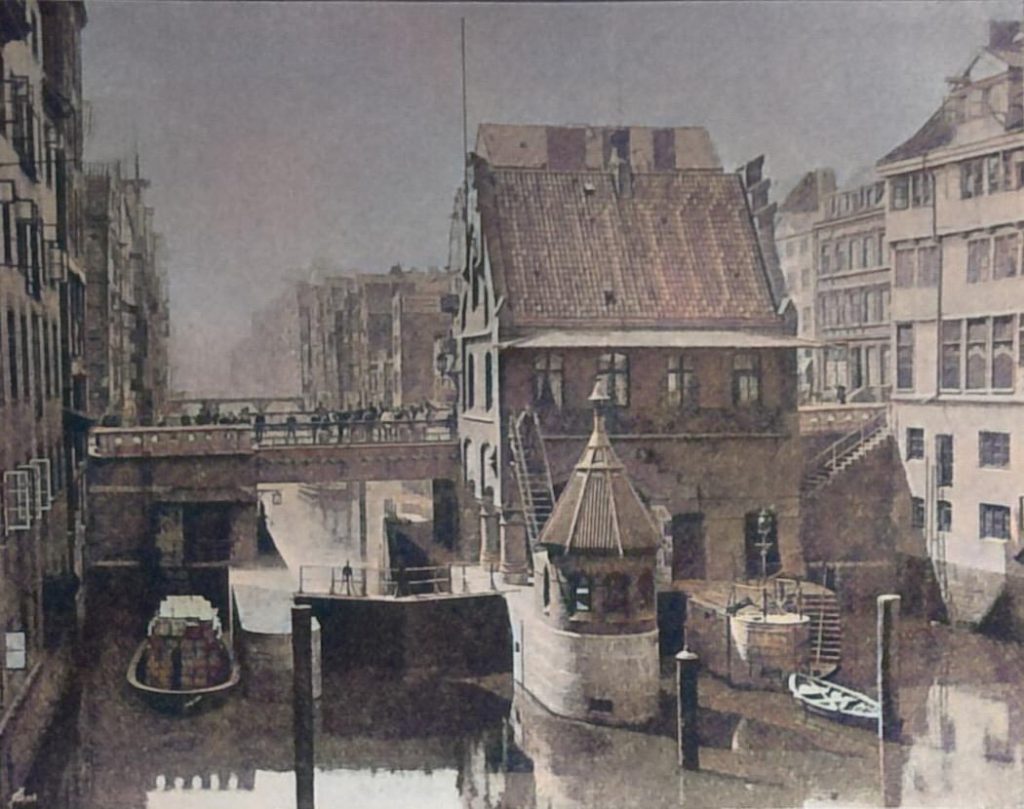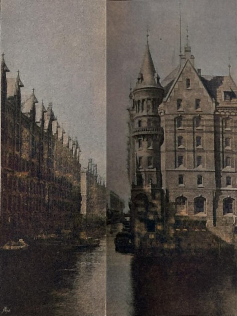 Zunächst wird über die Entstehung und bauliche Entwickelung Hamburgs und Altonas berichtet. Stadtpläne, die in rother und blauer Farbe auf den gegenwärtigen, blass gehaltenen Stadtplan aufgedruckt sind, veranschaulichen die Gestalt und den Umfang der Stadt sowie den Zustand von Elbe und Alster in den Jahren 1065, 1310, 1605 und 1720. Zahlreiche Abbildungen älterer, insbesondere der mittlerweile untergegangenen Gebäude geben Proben der Bauweise, welche hier ehemals herrschte; besonders interessant ist die verkleinerte Nachbildung einer in Kupfer gestochenen Stadtansicht von 1610. Mit einer durch Pläne und Ansichten erläuterten Darstellung des grossen Stadtbrandes von 1842 wird die wechselvolle ältere Geschichte der Entwickelung Hamburgs in diejenige der Neuzeit übergeführt, welche durch das schnellere Anwachsen der Bevölkerung und den Zollanschluss Umwälzungen mit sich gebracht hat, die denjenigen früherer Zeiten kaum nachstehen. Die Nachbildungen zweier grosser Stadtpläne von 1880 und 1890 geben davon ein sehr anschauliches Bild. Mit einer Anzahl von statistischen Uebersichten, die in graphischer Darstellung gegeben sind und sich auf die Bevölkerung und die Wohnungs-Verhältnisse, auf die Entwickelung der Seeschiffahrt und auf die Waaren – Ein- und Ausfuhr mittels See- und Fluss-Schiffahrt bezw. mittels der Eisenbahnen beziehen, schliesst der erste, mit 84 Abbildungen ausgestattete Abschnitt.