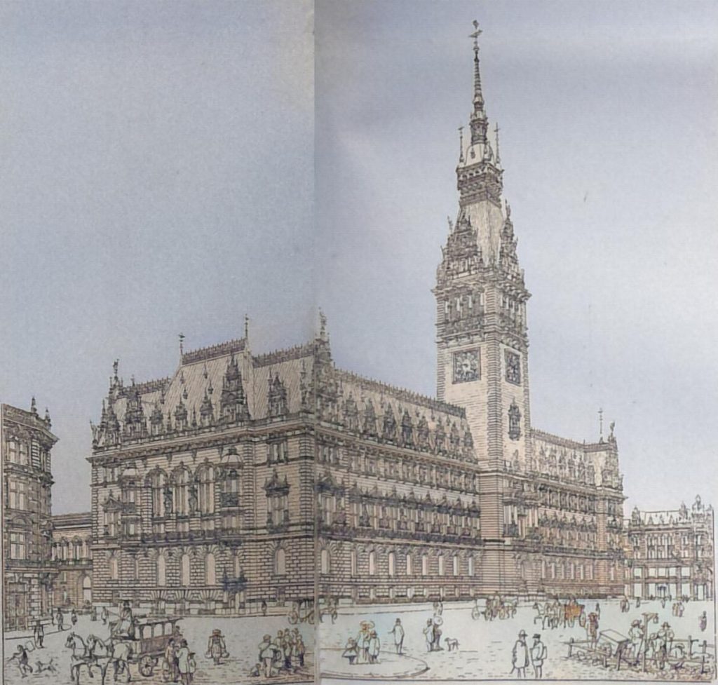 Die Darstellung des öffentlichen Bauwesens beginnt mit den Kirchen, deren Abbildungen leider in etwas gar zu kleinem Maasstab gehalten sind und wendet sich dann zunächst dem neuen Rathhause zu. Es folgen die Gebäude für Sammlungen und wissenschaftliche Institute (Kunsthalle, Gewerbe-Museum, Naturhistorisches Museum, Seewarte, Zoologischer Garten usw.), die Schulgebäude mit Turnhallen, Waisenhaus, Taubstummen-Anstalt usw., die Theater, Gesellschaftshäuser und Panoramen, die Gebäude für Rechtspflege, Börse und Münze, Militärgebäude, Verwaltungs-Gebäude (darunter das Gebäude der Reichspost), Stifte (welche in H. bekanntlich zu einer besonders grossartigen Entwickelung gelangt sind), Volks-Kaffee- und Speise-Hallen, Bade- und Waschanstalten, (darunter die trefflichen Freibade-Anstalten in der Alster), Krankenhäuser (darunter das neue allgemeine Krankenhaus in Eppendorf und die Irrenaustalt Friedrichsberg), die Schlacht- und Viehhöfe, die Anlagen für Feuerlöschwesen, die Friedhöfe und deren Denkmäler (Zentral-Friedhof in Ohlsdorf).
