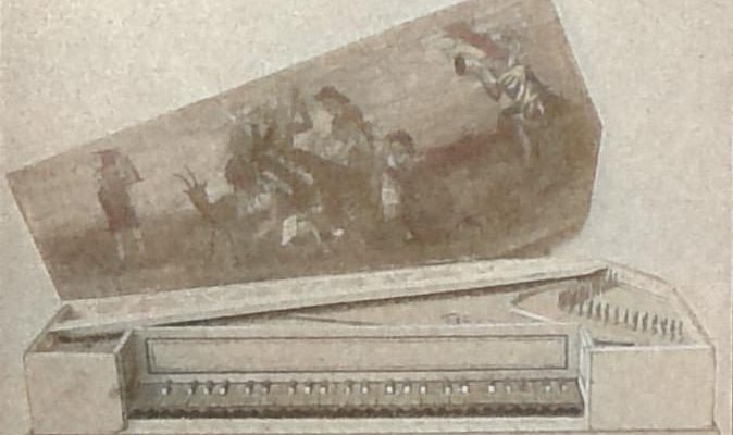 Auch das sechssaitige Spinett aus dem sechzehnten Jahrhundert, das Abb. 1 zeigt, würde mit seinem näselnden Ton einem Paderewski oder d’Albert schwerlich genügen. Bemerkenswert an diesem Instrument ist das allerliebste, mit Emblemen aus der Welt der Tiere und Narren geschmückte Gemälde auf der Innenseite des hochgeklappten Deckels, das in der Hauptsache die so.