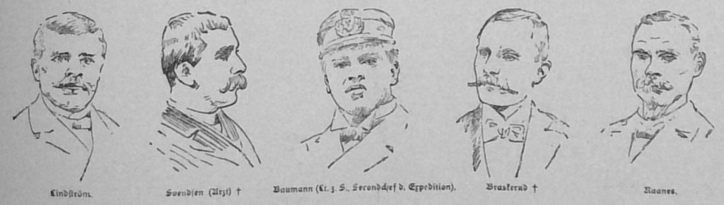 Sverdrups Begleitung setzte sich aus 15 Personen zusammen, deren Porträts wir hier bringen. Sechs Begleiter waren wissenschaftlich ausgebildet; Geologie, Botanik, Zoologie, Astronomie und Physik waren durch Fachmänner vertreten. Ein Offizier übernahm die kartographischen Arbeiten, während der Schiffsarzt, der leider bald nach Beginn der Reise starb, die meteorologischen Beobachtungen vornahm. Anstelle des verstorbenen Arztes unterzog sich Sperdrup selbst der Aufgabe, in den leider zahlreichen Krankheitsfällen Hilfe zu leisten.