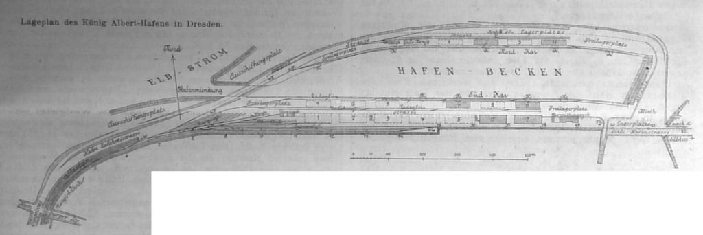 Von C. F. Richard Müller, kgl. Bauinspektor a. D. Im Zusammenhange mit den Dresdener Bahnhofsbauten wurde bekanntlich der neue Verkehrs- und Winterhafen, König Albert-Hafen, in Dresden-Friedrichstadt erbaut und am 1. Nov. 1895 (Nordkai) bezw. 1. Aug. 1896 (Südkai) inbetrieb genommen.