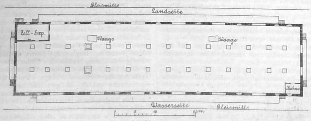Schuppen 4 u. 6 auf dem Südkai mit allseitiger Brunnengründung und Mauerstärken sowie Pfeilergründungen für Tragsäulen zum späteren Aufbau eines Stockwerkes eingerichtet zu 92 898 M. d. h. 72 M. für 1 qm bebaute Grundfläche; hiervon entfallen 17 350 M. auf die Brunnengründungen.