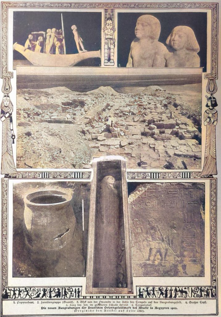 Neben einer Leiche aus griechischer Zeit wurde ein auf Papyrus geschriebenes Buch entdeckt, das eine poetische Verherrlichung der Perserkriege aus der Feder eines im Altertum hochberühmten Dichters Timotheos enthält. Die Mehrzahl dieser Funde ist nach Deutschland gelangt; sie waren im Berliner Museum ausgestellt und sollen nunmehr an verschiedene deutsche Sammlungen verteilt werden. Die Ausgrabung des Totentempels des Pharao Ne-woser-re wird in diesen Winter fortgesetzt; möge sie ebenso reiche Funde bringen wie die Kampagne, auf die die deutsche Orientgesellschaft mit rechtem Stolze zurückblicken darf.