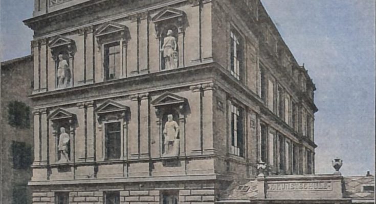 Architekt: Oberbaurath v. Bok. Vor kurzem ist durch Einfügung des dafür bestimmten Skulpturenschmucks ein neuer Staatsbau der württembergischen Hauptstadt, die kgl. Kunstschule, zu gänzlicher Vollendung gelangt.