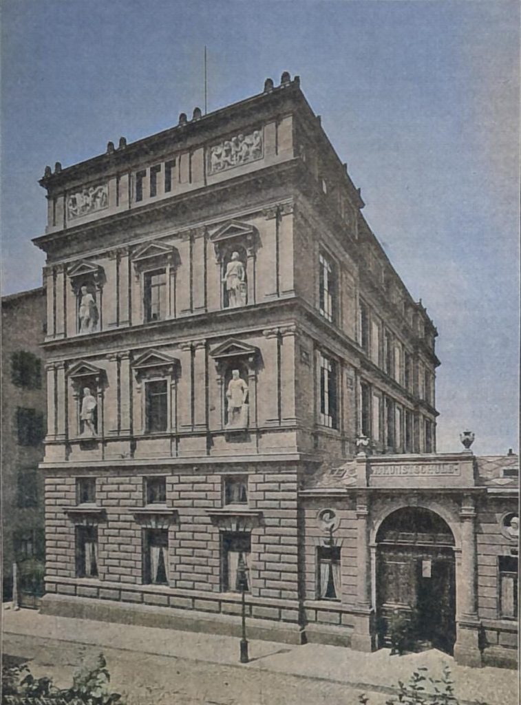 Die Fassaden des Gebäudes sind in Werkstein-Ausführung (unter Verwendung von Kunststein zu gewissen Gesims-Gliederungen) und – im Anschluss an die Architektur des benachbarten Museums – in den Formen strenger italienischer Hochrenaissance ausgestaltet worden. Bei aller Einfachheit entbehren sie nicht eines würdigen und vornehmen Eindrucks. Als bezeichnenden Schmuck haben sie die von Herrn Bildhauer Rheineck in französischem Kalkstein ausgeführten Skulpturen an der Urbanstrasse erhalten: in den Nischen des I. und II. Obergeschosses die Standbilder von Raphael und Michel Angelo, Apelles und Phidias, in den beiden Füllungen des III. Obergeschosses 2 Kinderfriese, welche gleichfalls der Darstellung von Malerei und Bildhauerkunst gewidmet sind. – An der entgegengesetzten Westseite und der langen Nordfront sind an den Hauptpfeilern Felder ausgespart worden, an denen Medaillon-Portraits von Künstlern und allegorische Darstellungen, in Malerei ausgeführt, angebracht worden sind.