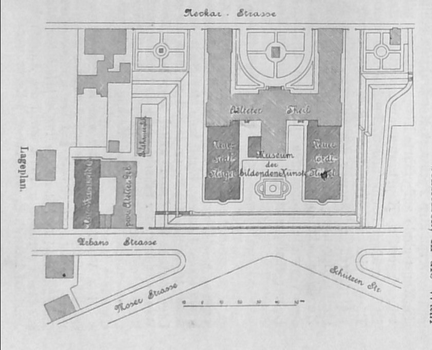 Wie so viele öffentliche Gebäude in unsern modernen, schnell anwachsenden Grossstädten, hat auch das in Rede stehende eine lange, unerfreuliche Vorgeschichte – ausgefüllt durch die Noth, einen geeigneten Bauplatz dafür ausfindig zu machen. Schon vor einem Viertel-Jahrhundert trat immer dringender das Bedürfniss hervor, für die bis dahin in dem ältern Gebäude des Museums der bildenden Künste an der Neckarstrasse vereinigten Kunstanstalten des Staates – die plastische, Gemälde- und Kupferstich- Sammlung, sowie die Kunstschule ausgiebigeren Raum zu beschaffen. Man glaubte anfänglich, dass für diesen Zweck eine Erweiterung des Museums durch 2 nach hinten vorspringende Flügelbauten genügen würde und bewilligte hierfür i. J. 1873 eine aus der französischen Kriegsentschädigung übernommene Summe. Aber bevor der Bau begann, ward man sich klar darüber, dass der auf diese Weise zu gewinnende Raum ausschliesslich zur Erweiterung der Sammlungen benöthigt werde, und man entschloss sich demzufolge, für die Bedürfnisse der Kunstschule die Errichtung eines selbständigen Gebäudes ins Auge zu fassen. Hierfür war i. J.