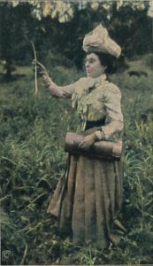 Am leichtesten ist’s natürlich unter kundiger Führung, wenn man auf die Pflanzen aufmerksam gemacht wird (Abb. 3). An Ort und Stelle hält der Professor seinen Vortrag über die Pflanze, erzählt uns ihre Lebensgeschichte die uns das Gewächs innerlich näherbringt. Dann wird das Kraut aus der Erde gehoben, mitsamt seinen Wurzeln und seinen sonstigen unterirdischen Teilen. da kann’s dann freilich im Anfang leicht einmal passieren, daß in blindem Eifer der horizontal kriechende Wurzelstock hartnäckig in der Erde bleibt und der Sammler trotz tiefen Grabens nur ein wurzelloses Stück herauszieht (Abb. 4). Bequemer hat man’s bei Sträuchern und Bäumen von denen man einen Zweig mit Blüten und Blättern und, wenn’s geht, mit Früchten abschneidet (Abb. 2). Ehe nun die Pflanze in die mitgeführte Blechtrommel, oder, was noch empfehlenswerter ist, in die mit Zeitungsbogen gefüllte Mappe wandert, versucht man, nach einem guten Werk, das die Lokalflora beschreibt, der Pflanze Art und Namen festzustellen. Die Frage: was ist’s ? macht manchem im Anfang viel Kopfzerbrechen, wird aber mit jeder Art, die man mehr kennen lernt, leichter, weil die Zahl der Unbekannten immer kleiner wird. Gerade dieses „Bestimmen“ schärft den Blick ganz unglaublich, weil man durch die Beschreibung auf die einzelnen Teile hingewiesen wird. In den meisten Fällen sieht man, was man sehen muß, mit bloßem Auge; wer aber ein schwach vergrößerndes Linsenglas, eine Lupe, hat, dem wird das Bestimmen häufig viel leichter, namentlich dann, wenn die Augen sich noch nicht folgsam auf einen Punkt richten wollen. Ist die Pflanze bestimmt, so wird sie am besten sofort in der Mappe auf einem halben Zeitungsbogen ausgebreitet, nachdem man einen kleinen Zettel mit Namen, Standort, Fundort und Datum beigelegt hat, mit einem zweiten Bogen bedeckt und zu Haus getrocknet. das Trocknen geschieht unter mäßigem Druck ein oder zwei Ziegelsteine auf einem Brett genügen meist. Damit das Trocknen schneller geht, legt man zwischen je zwei mit Pflanzen gefüllte Bogen ein Dutzend leerer Bogen, die täglich einmal erneuert werden, weil sie die Feuchtigkeit der zu trocknenden Pflanze aufsaugen. Die Pflanze ist trocken, wenn sie sich nicht mehr kalt anfühlt, und hält sich dann jahrhundertelang. Je schneller man trocknet, desto besser erhalten sich die Farben, weshalb manche auch stark angewärmtes Löschpapier zwischen die Pflanzen legen und in Drahtgitterpressen trocknen. Wer darüber mehr wissen will der sei auf meine kleine praktische „Anleitung für Pflanzensammler“ verwiesen.