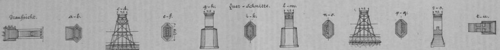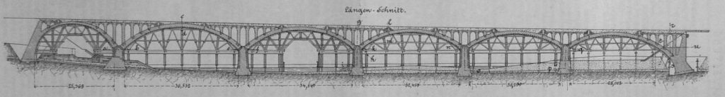Zum Vergleich mag die ältere, seit Mitte der 60er Jahre bestehende eiserne Eisenbahnbrücke mit 5 Oeffnungen zu je 35 m (mit Pauli’schen Trägern überdeckt) dienen, welche etwa 19 m hoch über Niederwasser unterhalb Kitzingen über den Main geführt ist. Diese Brücke wurde im Mauerwerk gleich anfänglich auf Doppelbahn hergestellt und die Eisenkonstruktion für das 2. Gleis in jüngster Zeit beigefügt. Die Gesammtkosten dieser Doppelbahn-Brücke beliefen sich auf rd. 751 000 M.