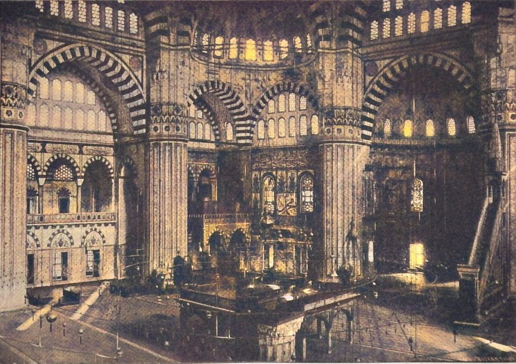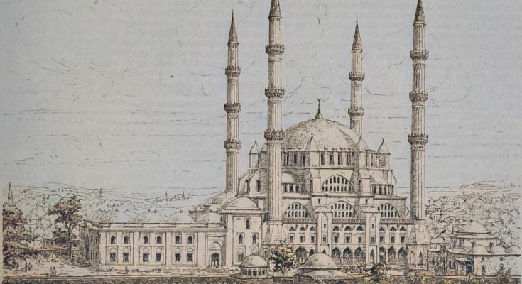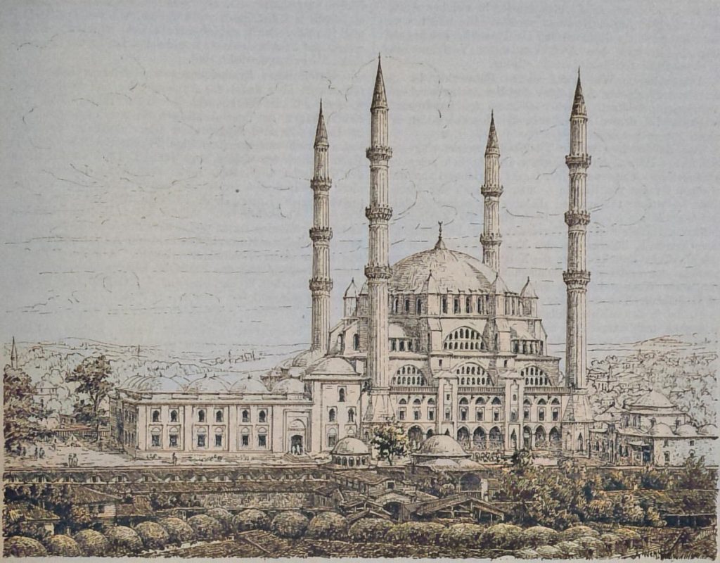 Was vor allem aber noch jetzt Adrianopel in den Augen des türkischen Volkes, in einer Beziehung wenigstens, weit über alle andern Städte des Reiches hinaus und selbst über das ehrwürdige Stambul hebt, ist jenes erhabene Baudenkmal aus den Zeiten der Blüthe des Reiches, die von dem grossen türkischen Meister Sinan auf Sultan Selim’s II. Geheiss erbaute und nach ihm benannte Moschee. Sie darf in der That noch heute als ein Nationalwerk eigener Art gelten, welches nicht nur dem Osmanenthum zu hohem Ruhm gereicht, sondern auch vom Standpunkt des allgemeinen kunstgeschichtlichen Interesses von bemerkenswerther Bedeutung ist.